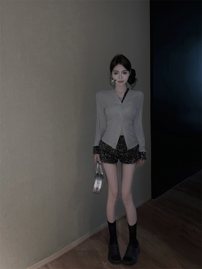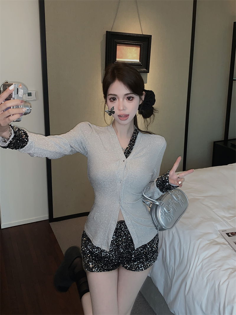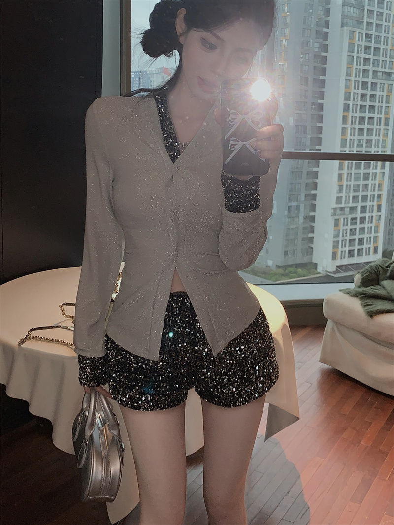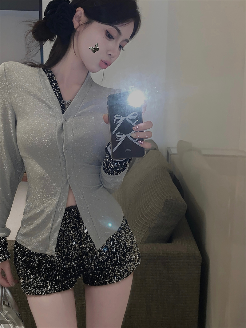 PF2864#V领针织开衫 新款气质名媛银色亮片短裤套装