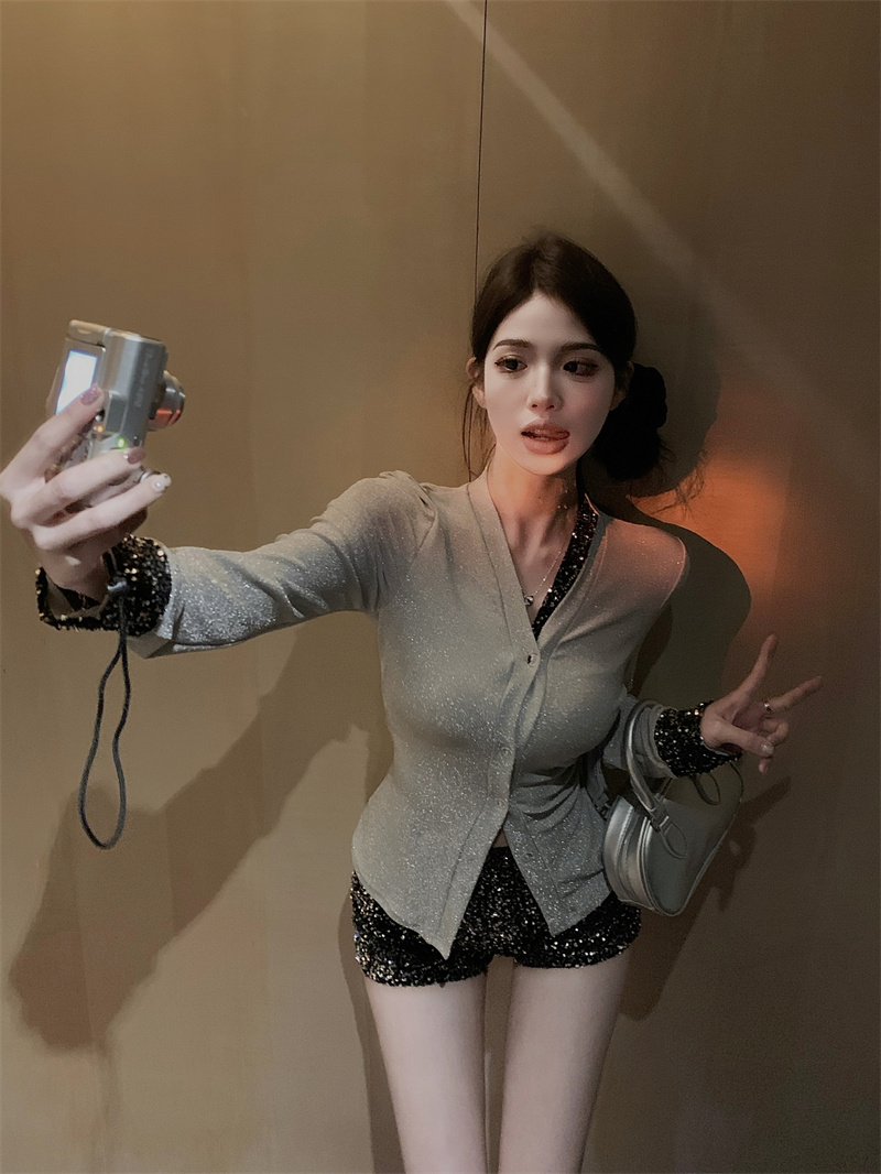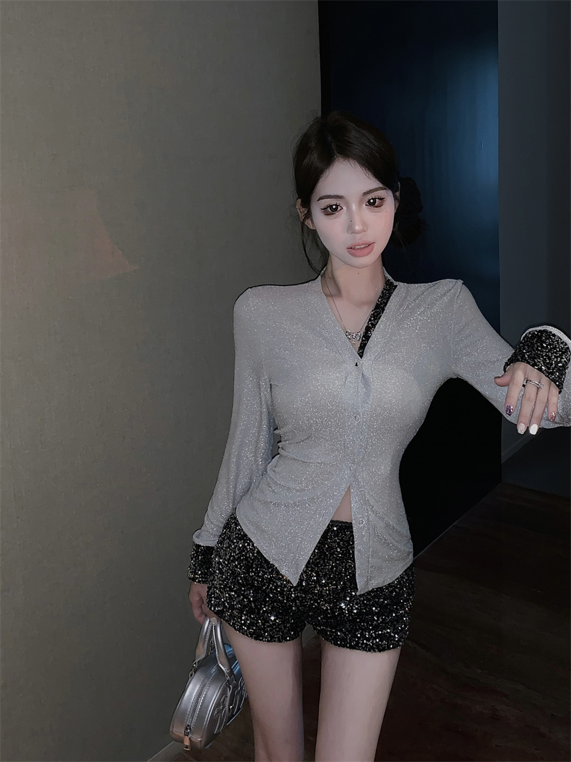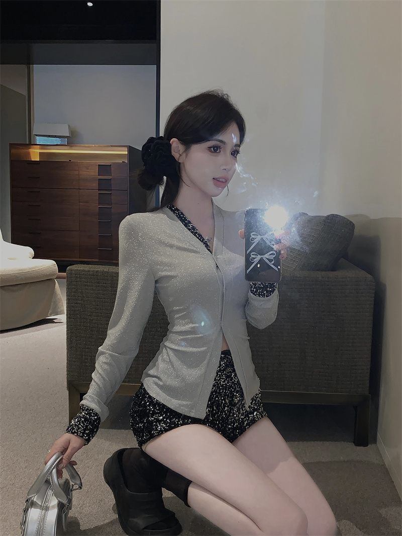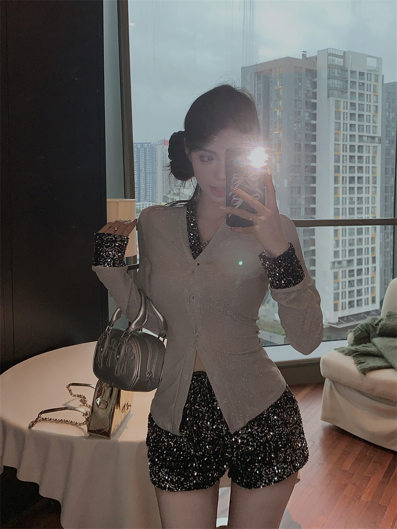 PF2864#V领针织开衫 新款气质名媛银色亮片短裤套装