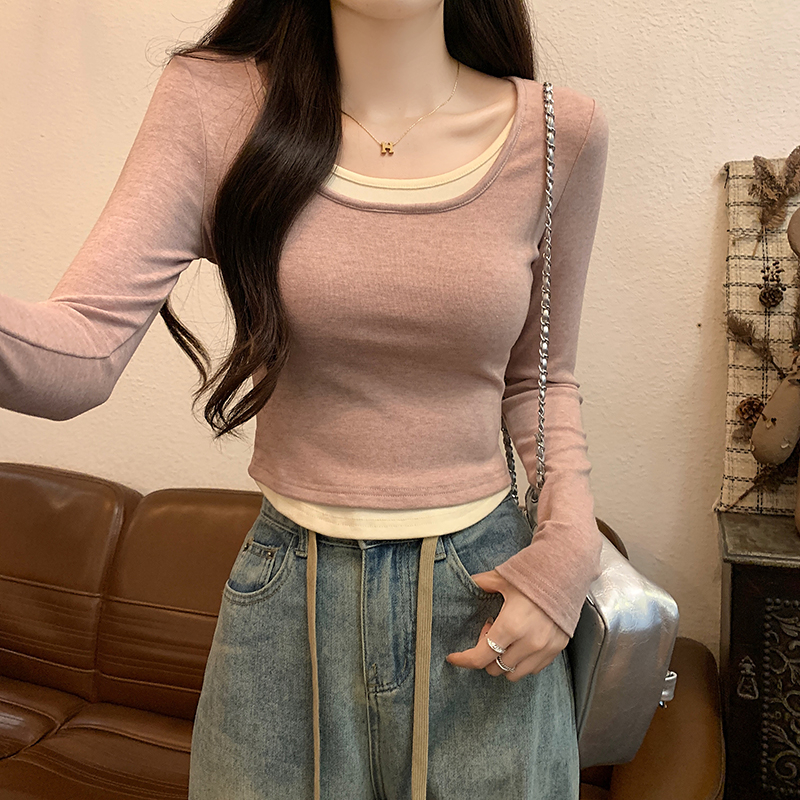 PF3059#双面羊绒长袖t恤女春秋薄假两件打底衫圆领上衣大码女装