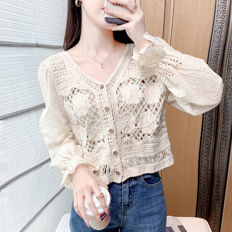 PF3186#新款法式复古拼接镂空V领衬衫女小众雪纺泡泡袖上衣