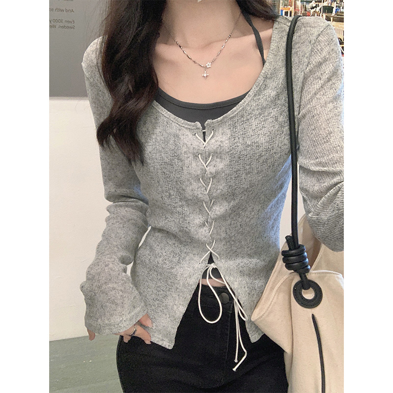 PF3234#螺纹气质显瘦长袖t恤女挂脖露骨抽绳叠穿假两件短款上衣