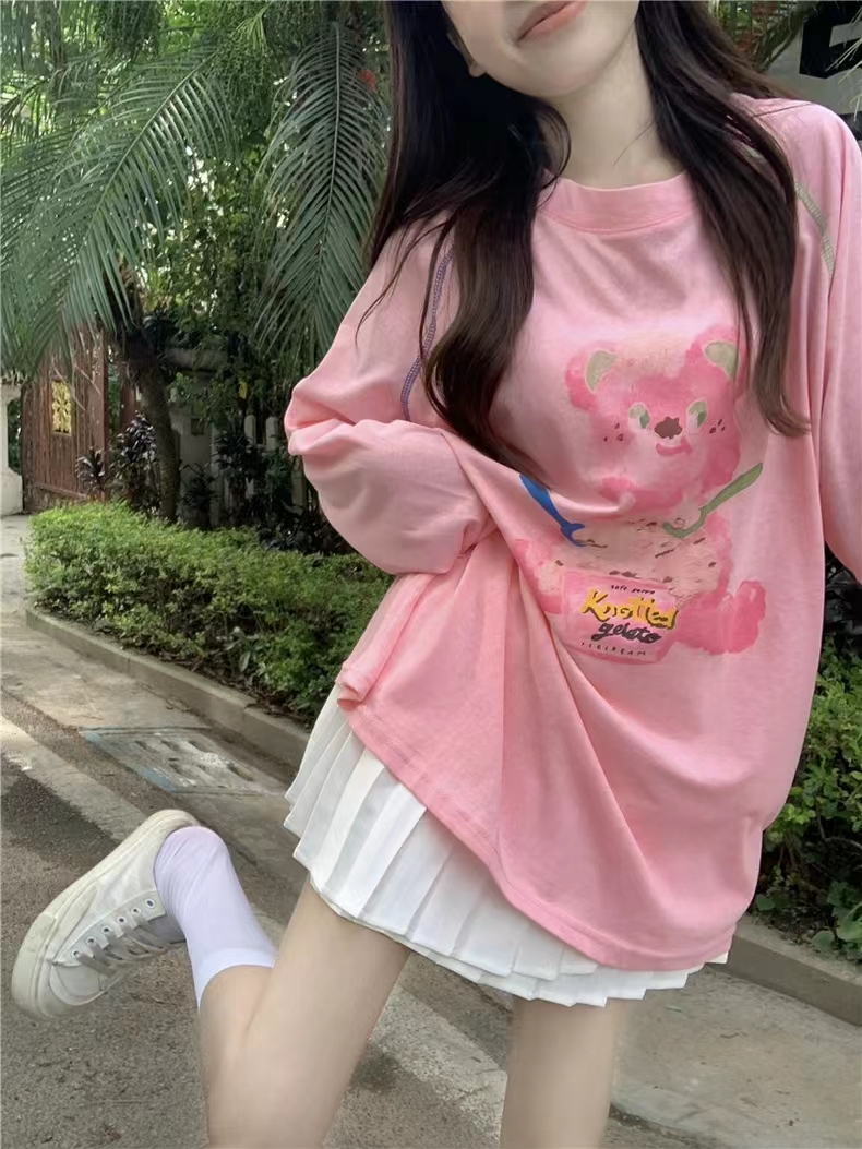 PF3377#韩系多巴胺粉色圆领长袖印花防晒衣打底衫女夏季宽松长款T恤上衣