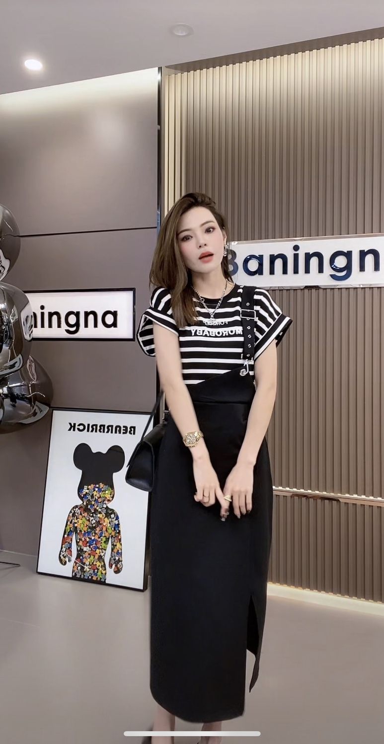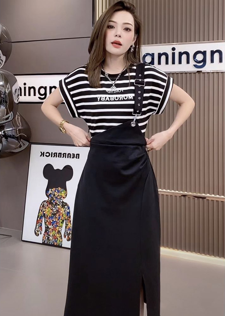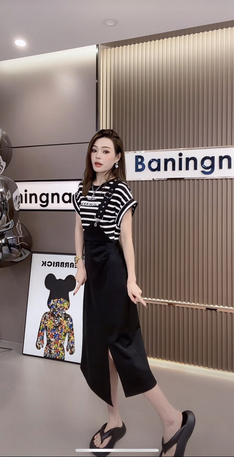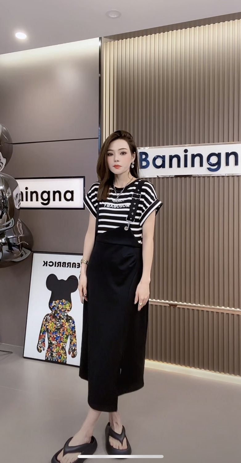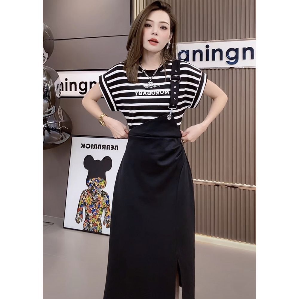 PF3391#韩版休闲背带裙假两件连衣裙2024夏季新款时尚条纹拼接百搭L-5XL