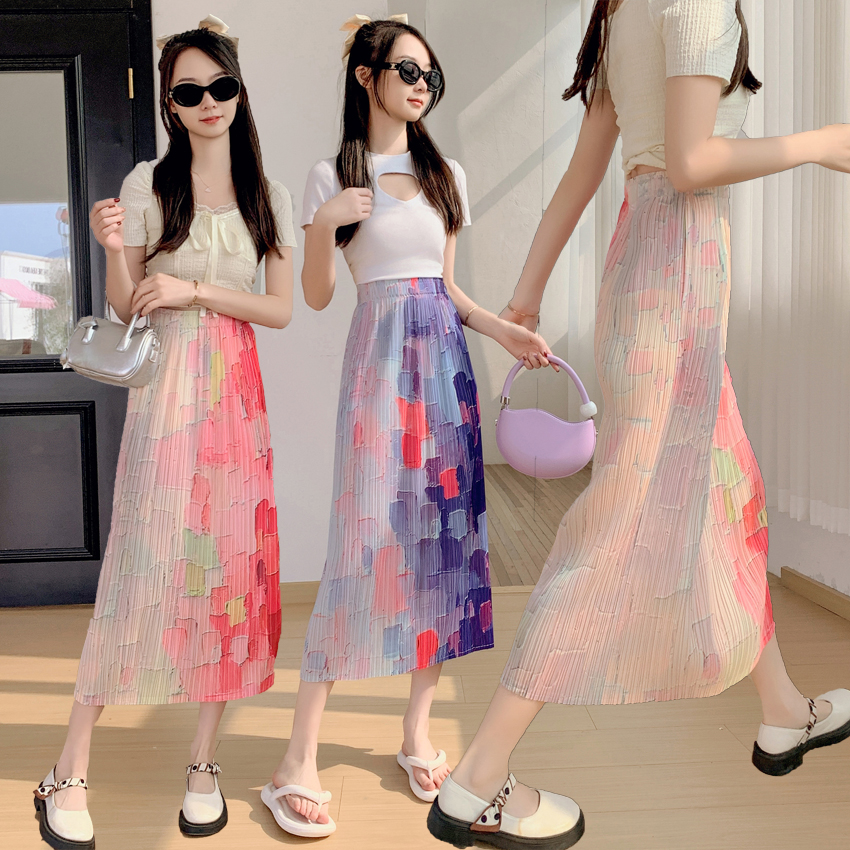 PF3621#宅褶皱2024春夏百褶直筒包臀裙渐变色中长款开叉半身裙A字裙