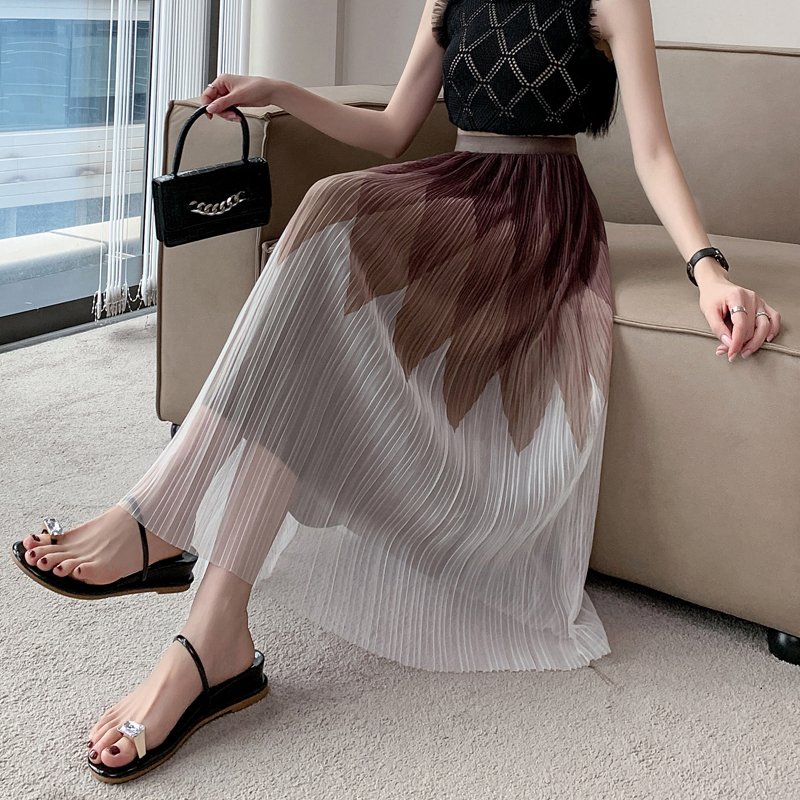 PF3809#新款渐变网纱半身裙女春夏季小个子裙子百褶裙长裙半裙A字裙