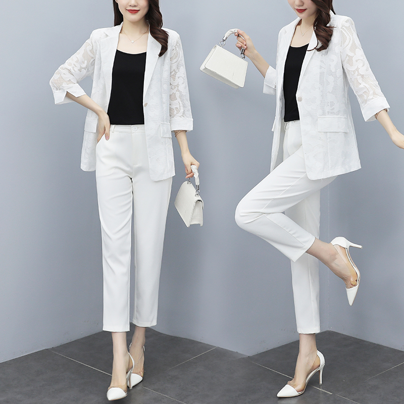 PF3868#大码西装上衣女2024夏季新款胖妹妹气质洋气蕾丝七分袖西服外套
