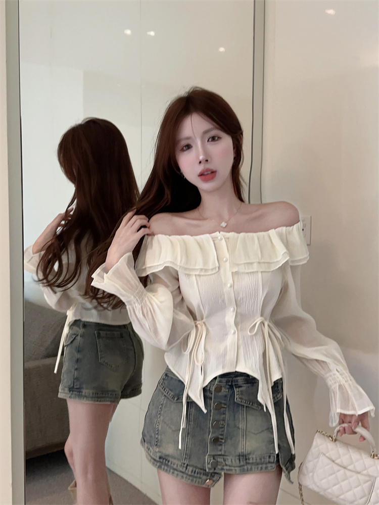 PF3884#小众性感一字肩设计感荷叶边系带抽绳喇叭袖不规则上衣
