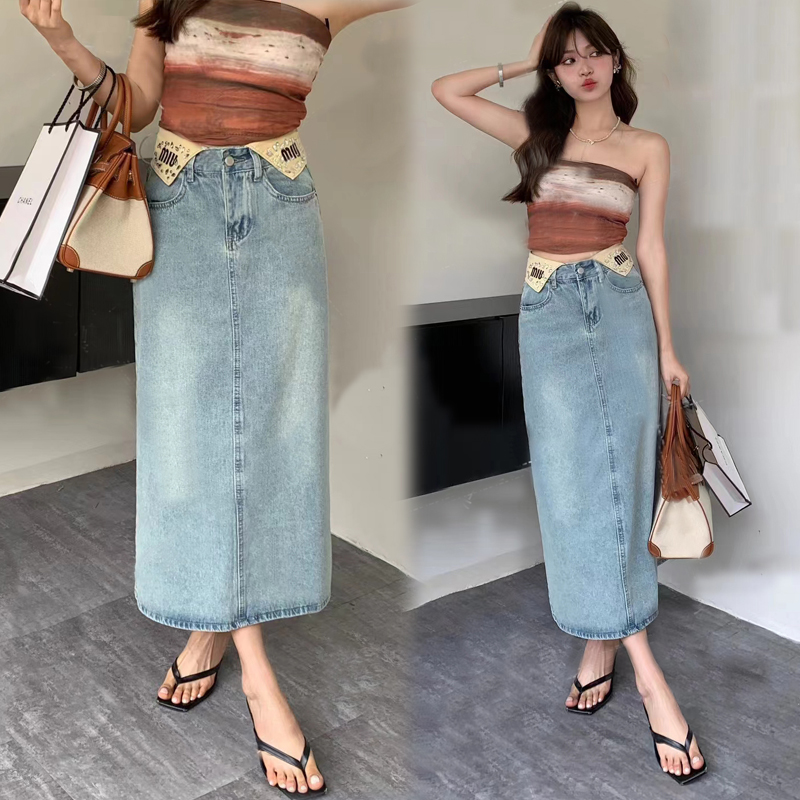 PF3897#重工艺轻奢烫钻2024年春夏新款字母绣花腰封设计中长款牛仔半身裙