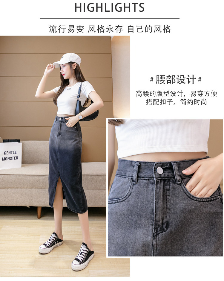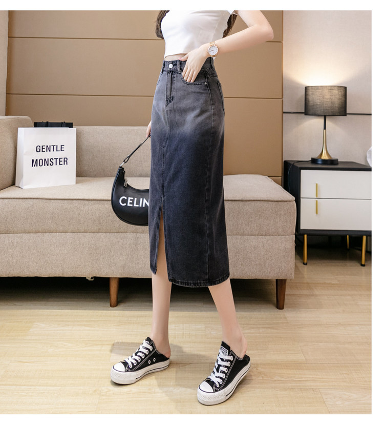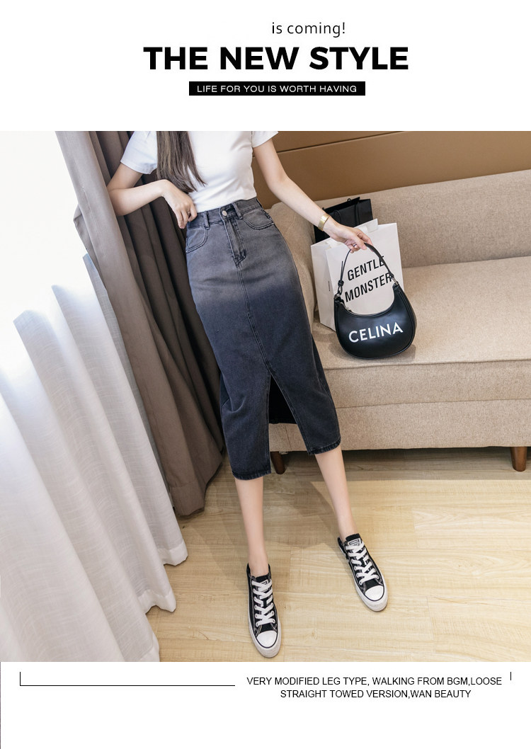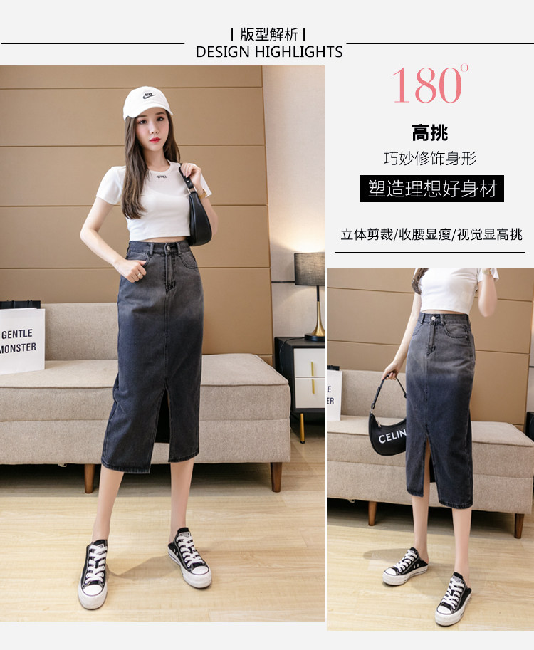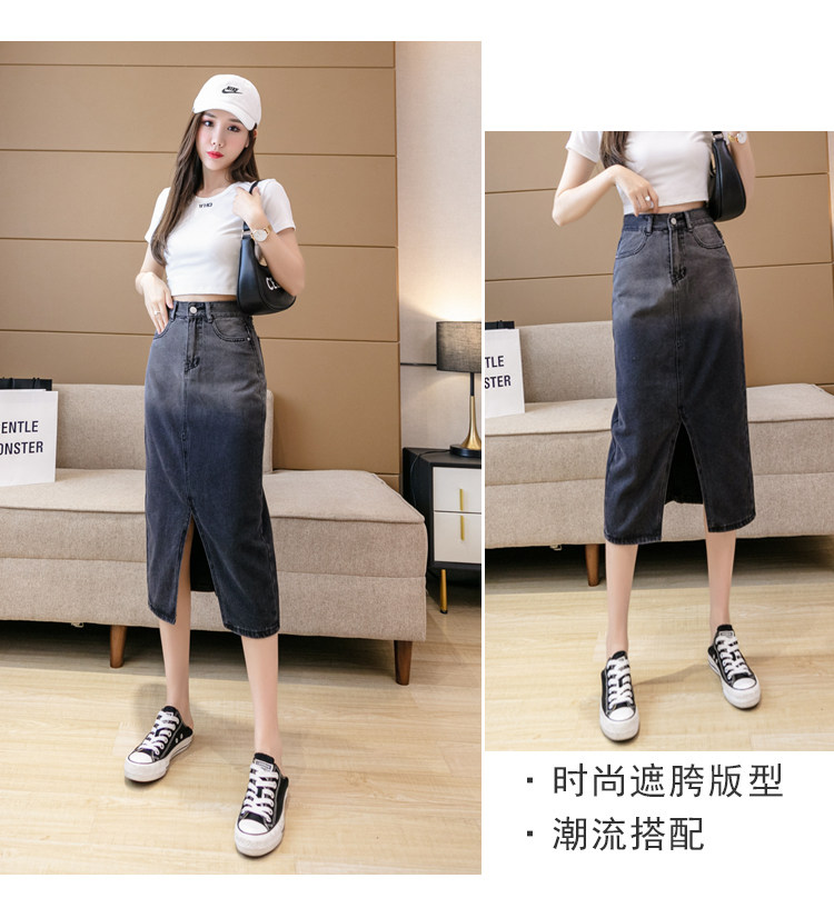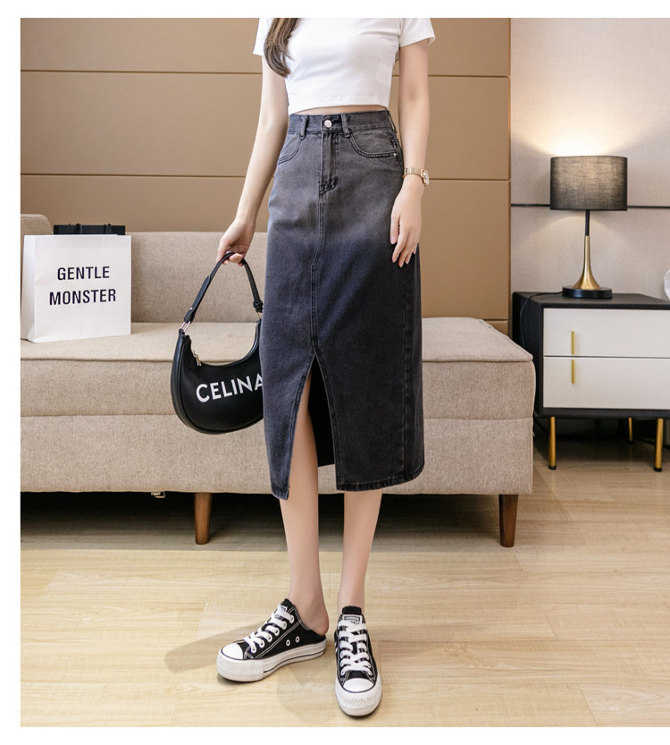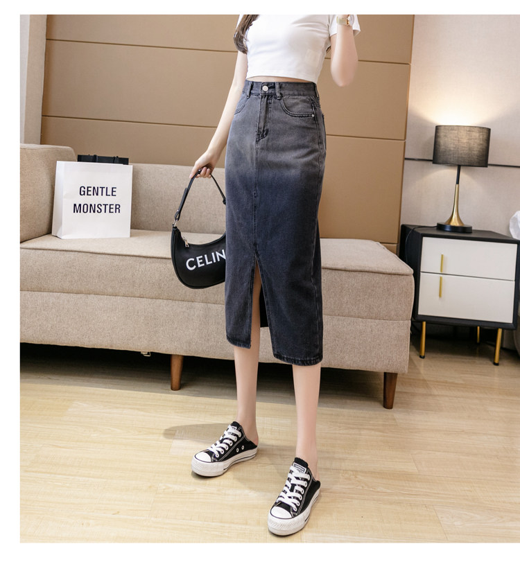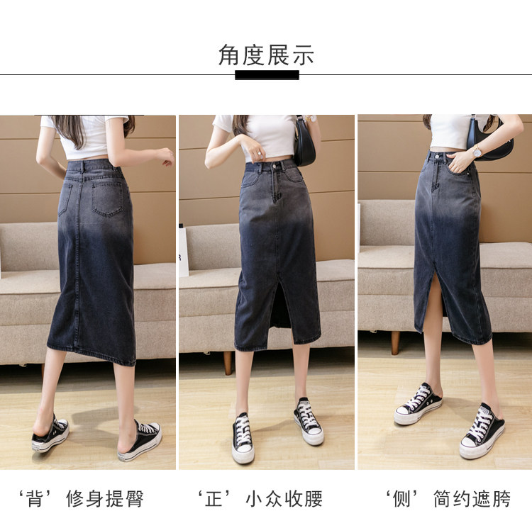 PF3940#渐变色开叉牛仔半身裙女2024年夏季高腰显瘦中长款一步包臀裙