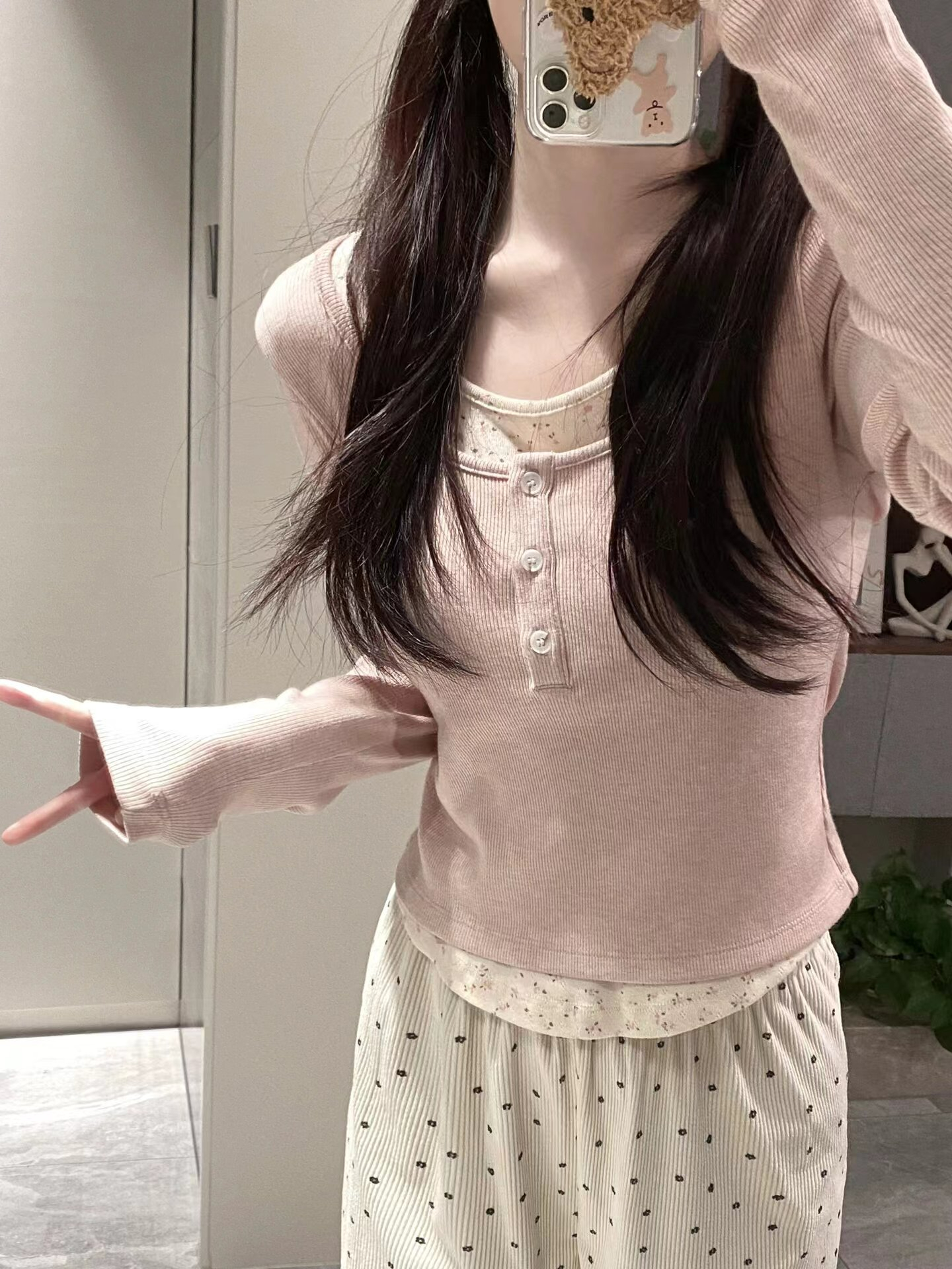 PF3970#粉色纯欲bm风假两件碎花打底衫女春季内搭独特别致小个子短款