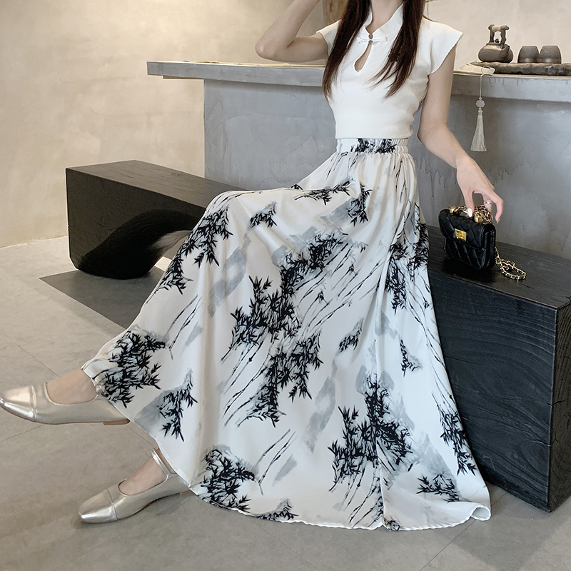 PF3977#新款优雅气质水墨印花大摆A字裙女半身长裙字优质版