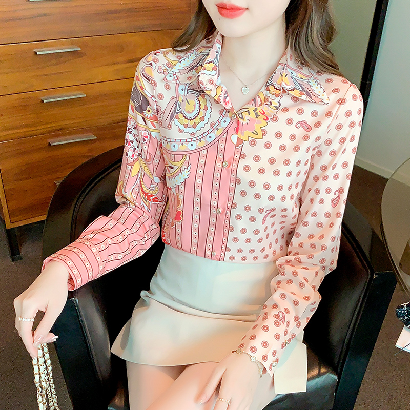 PF3992#新款印花桑蚕丝翻领长袖真丝衬衫欧货高档洋气小衫