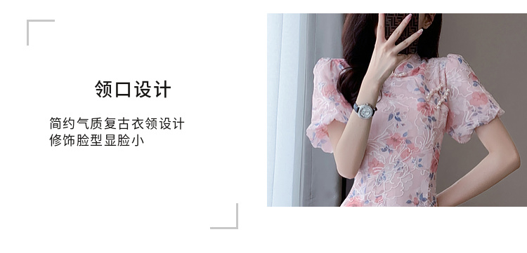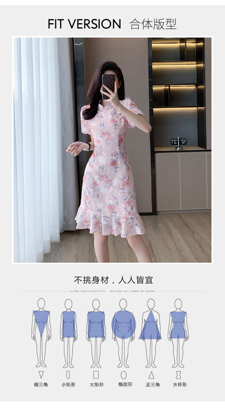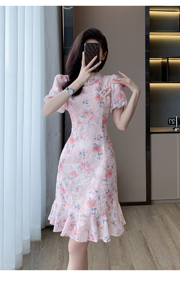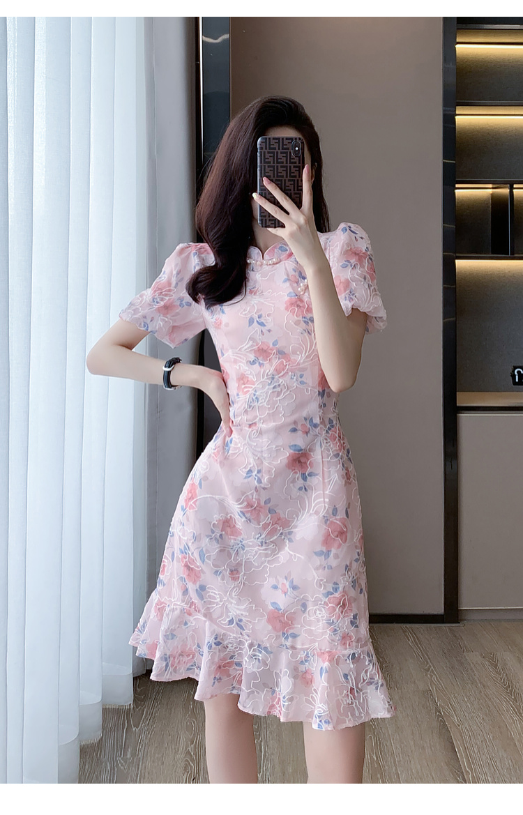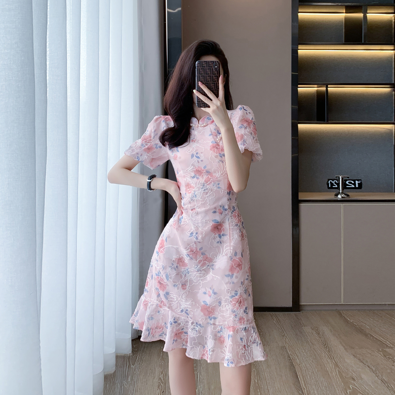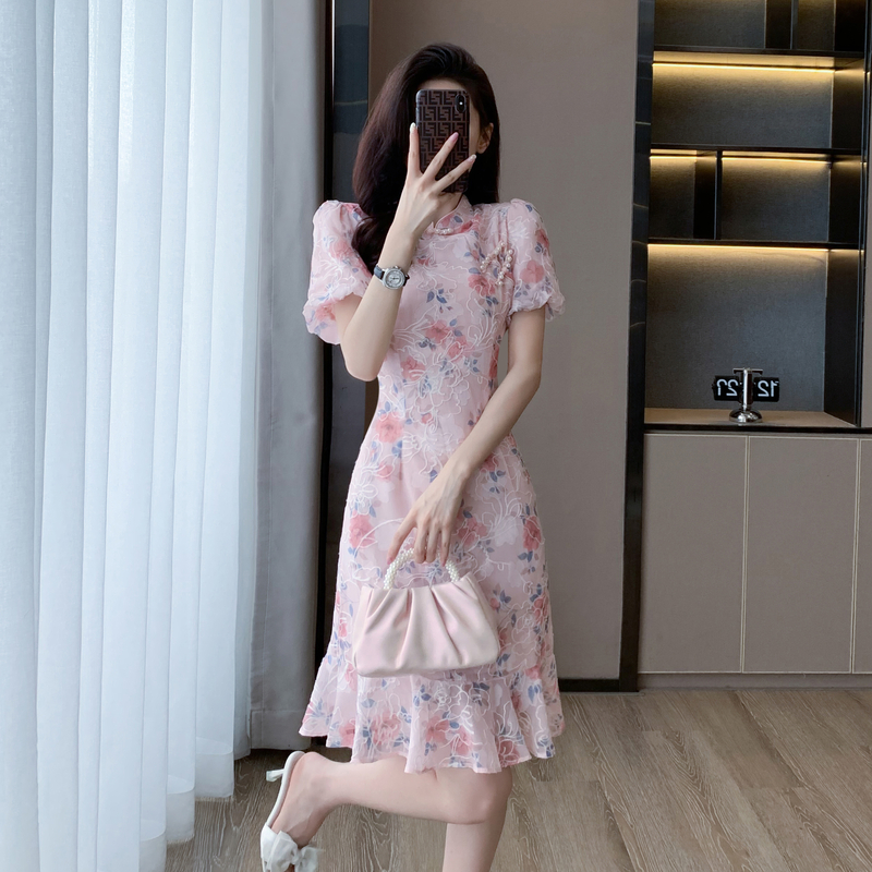 PF4431#原单专柜大牌高级感复古重工绣花盘扣收腰显瘦改良旗袍碎花连衣裙女裝批發 服裝批發 服裝貨源