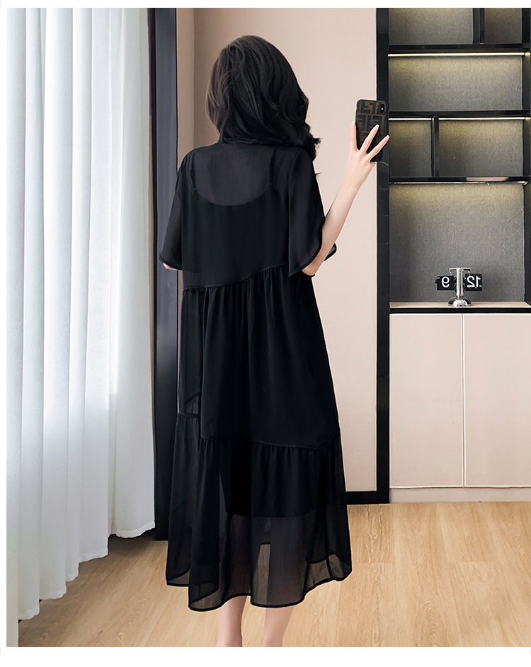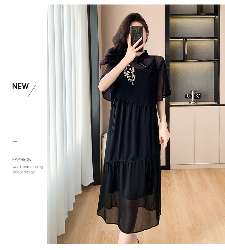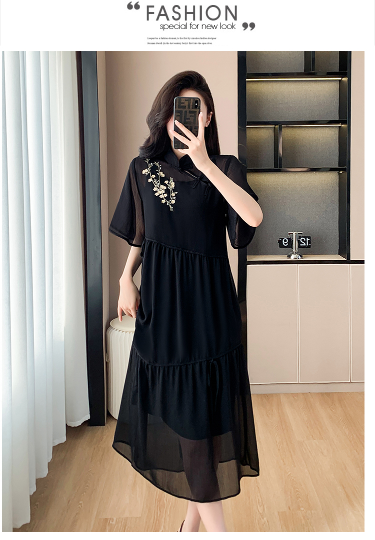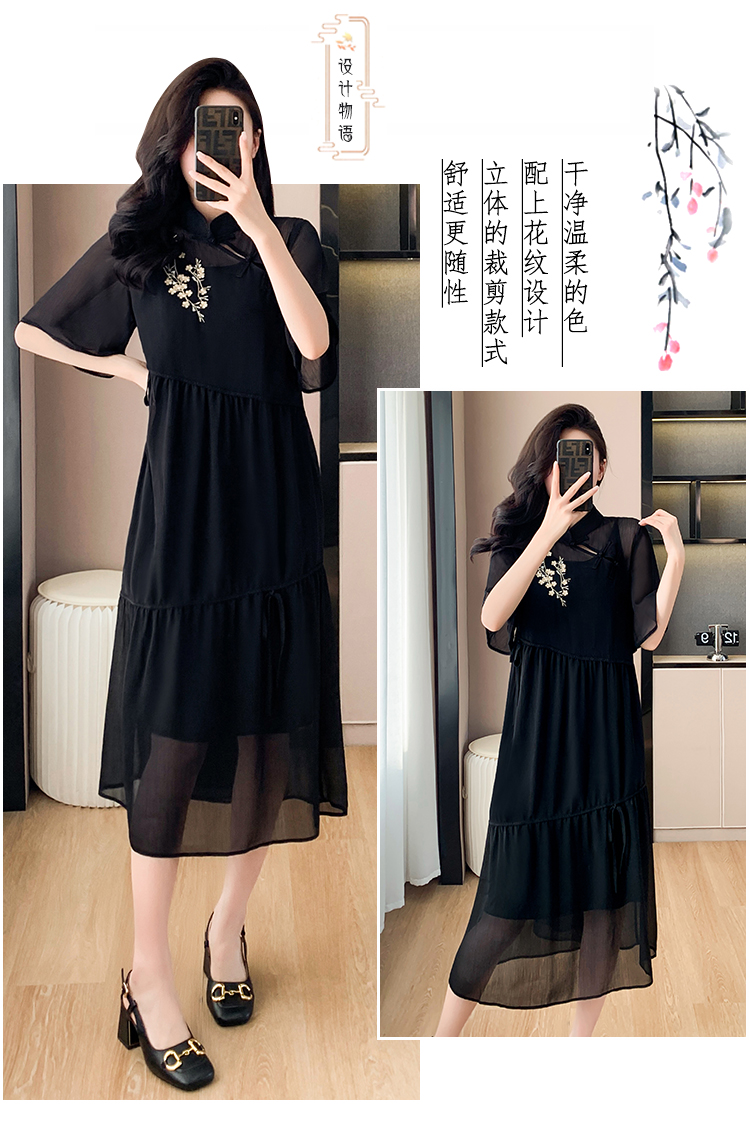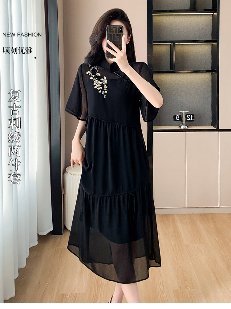 PF4503#大码女装改良旗袍雪纺复古刺绣修身夏季短袖中长裙两件套女裝批發 服裝批發 服裝貨源