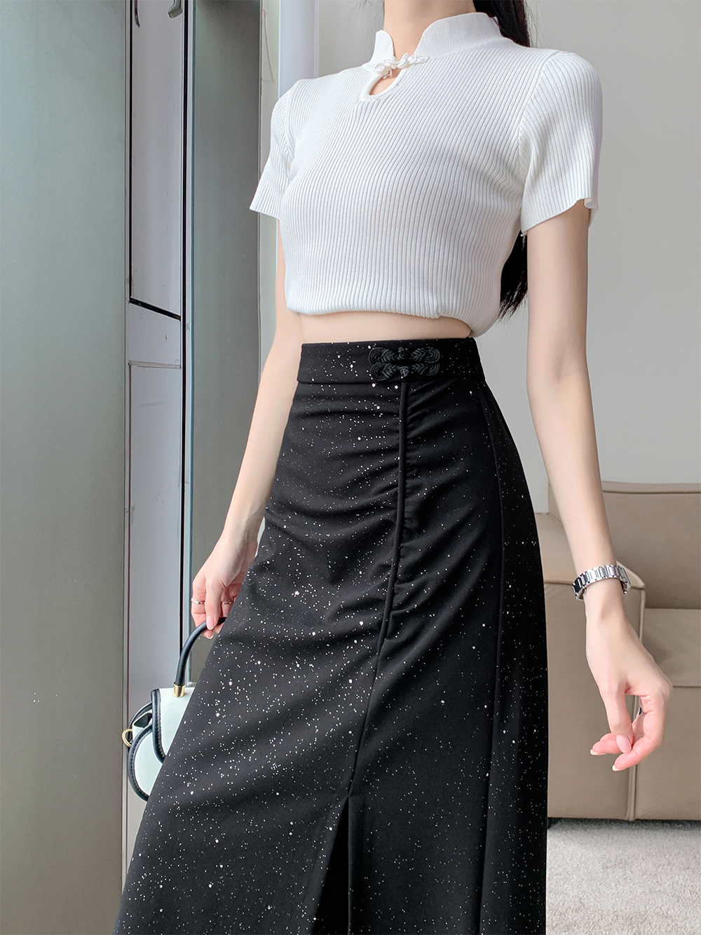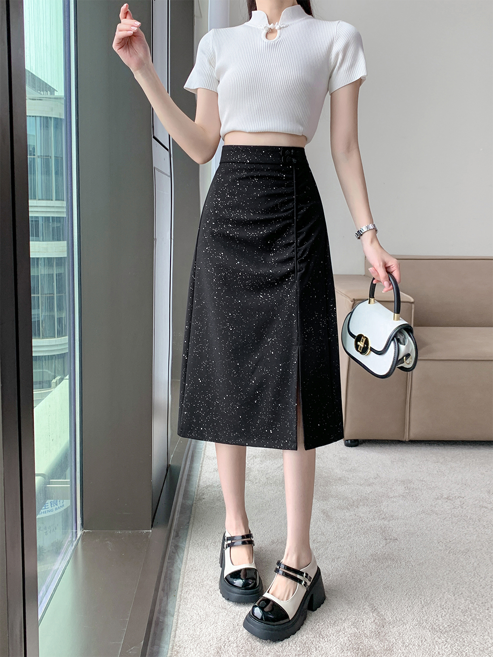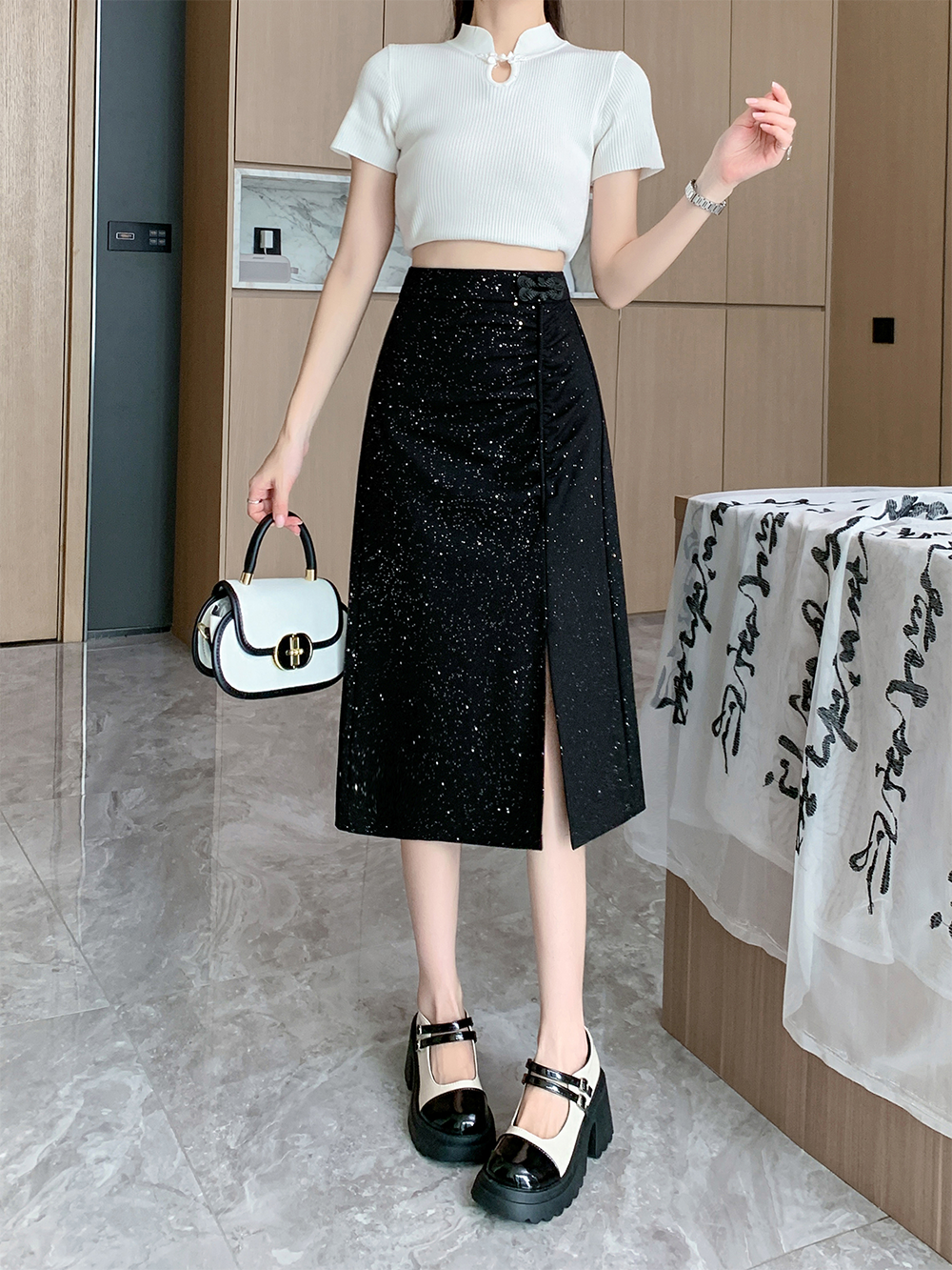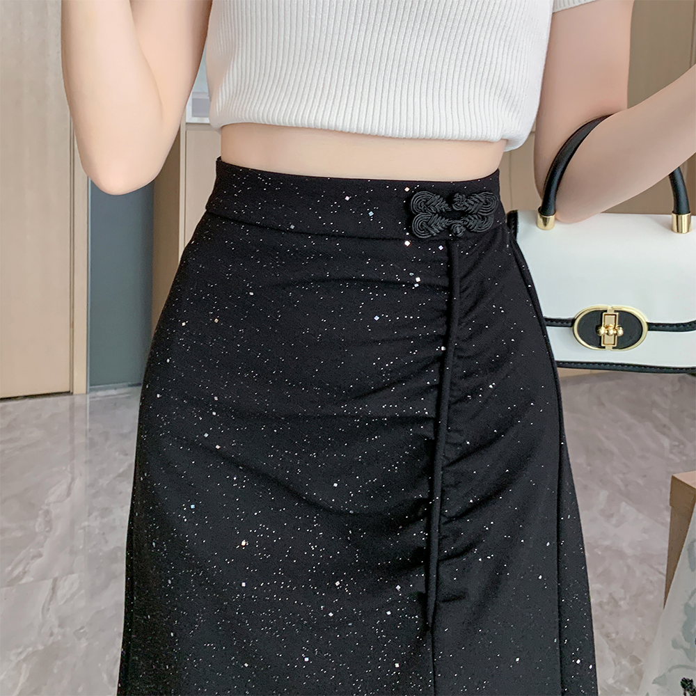 PF4509#大码春夏新中式国风弹力盘扣半身裙A字裙高腰显瘦前开叉裙女裝批發 服裝批發 服裝貨源