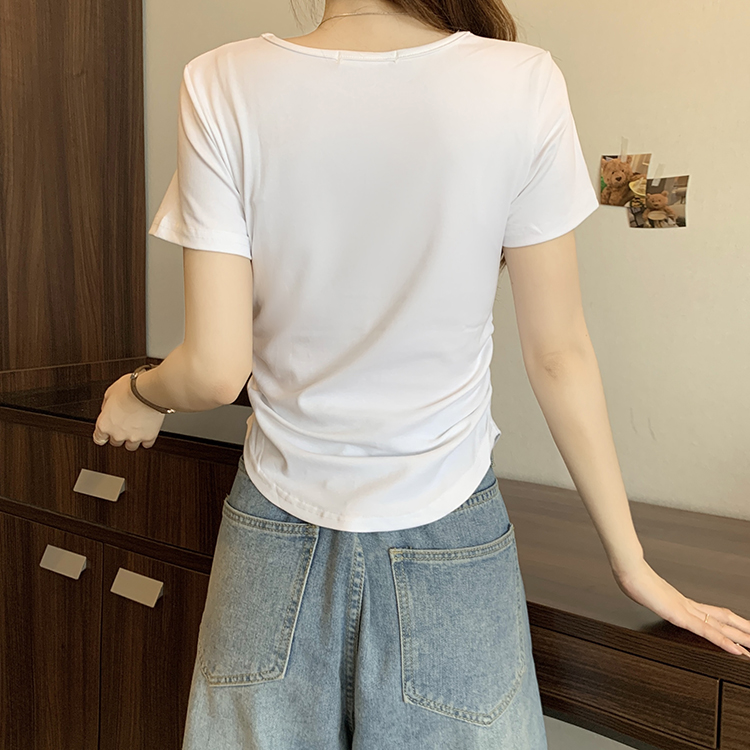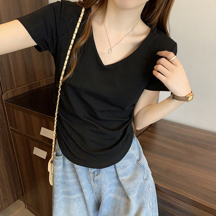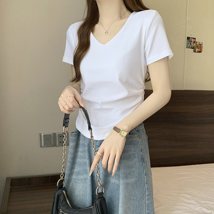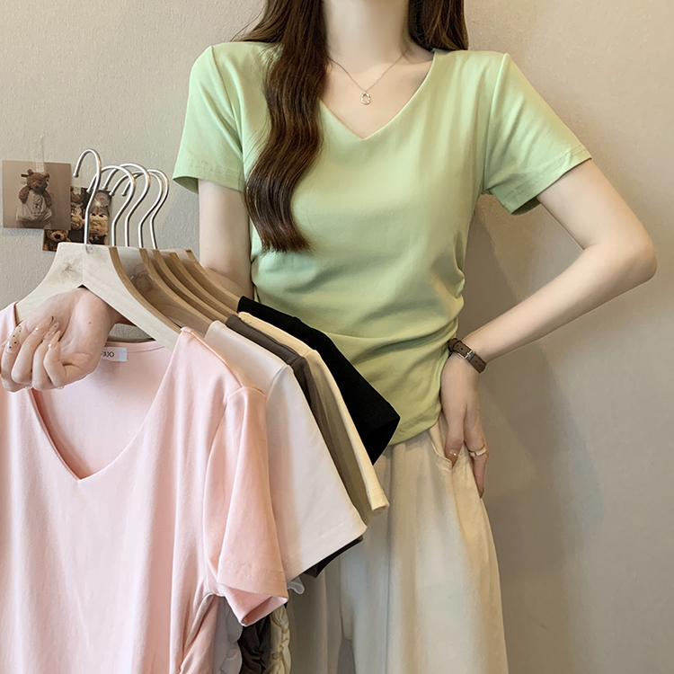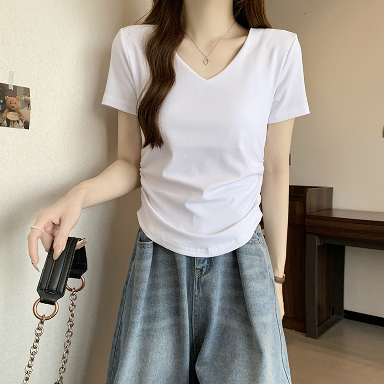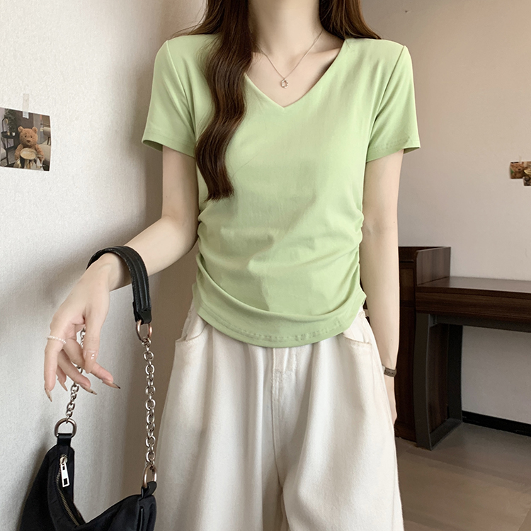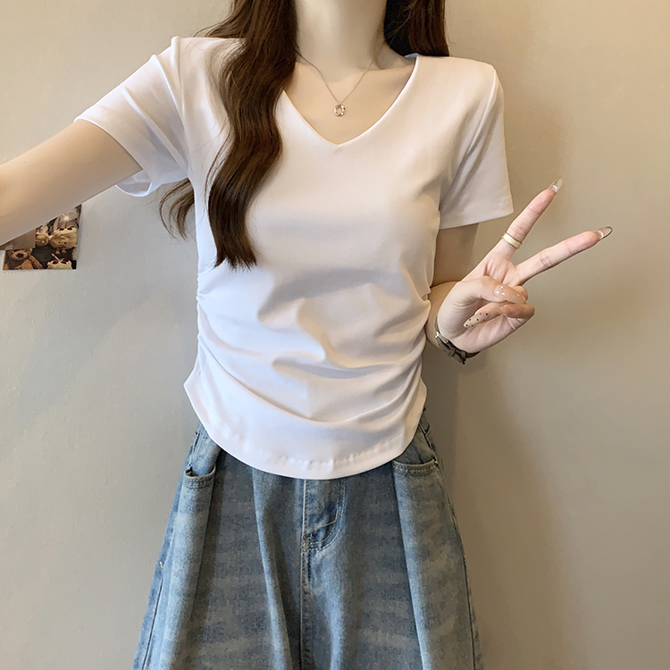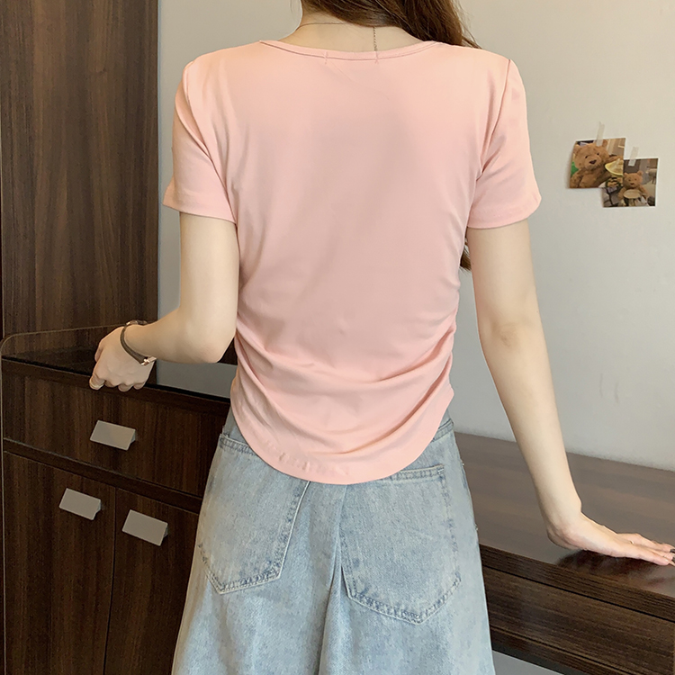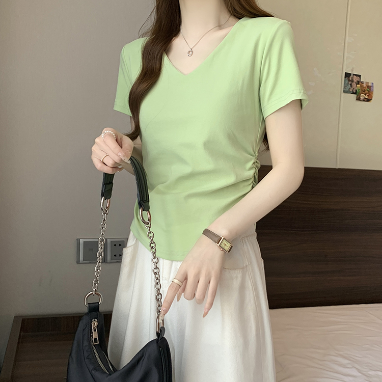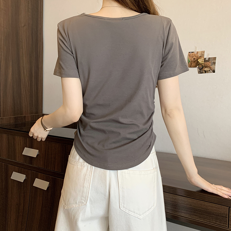 PF4533#夏装新款胖mm时尚百搭修身甜辣妹纯色抽褶短袖上衣T恤女裝批發 服裝批發 服裝貨源