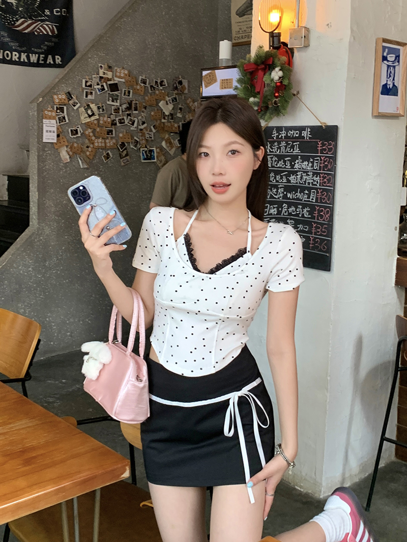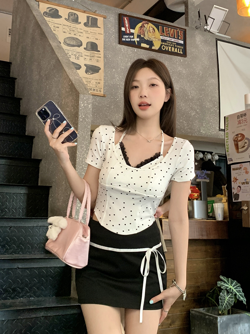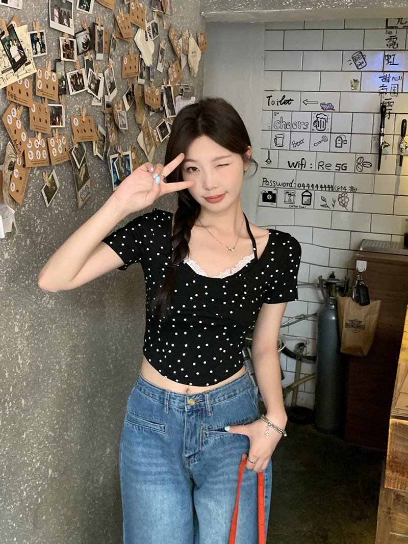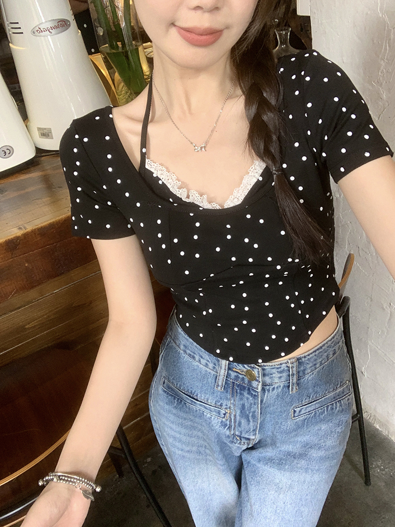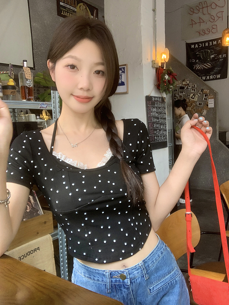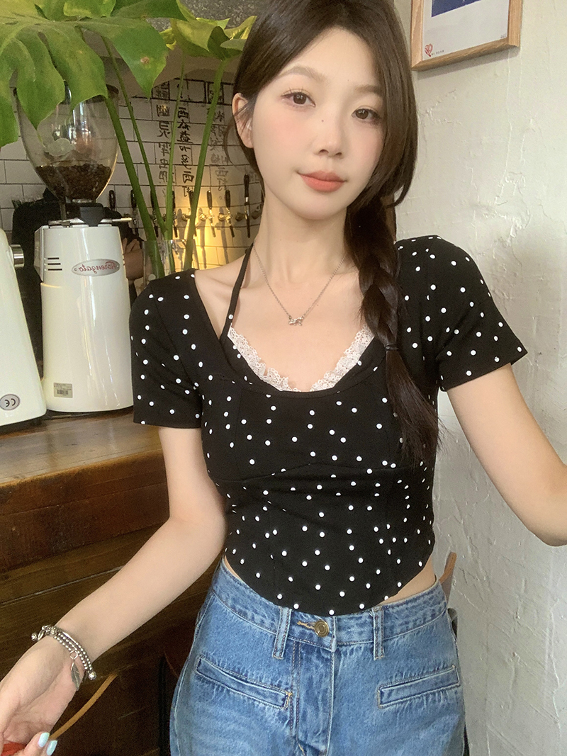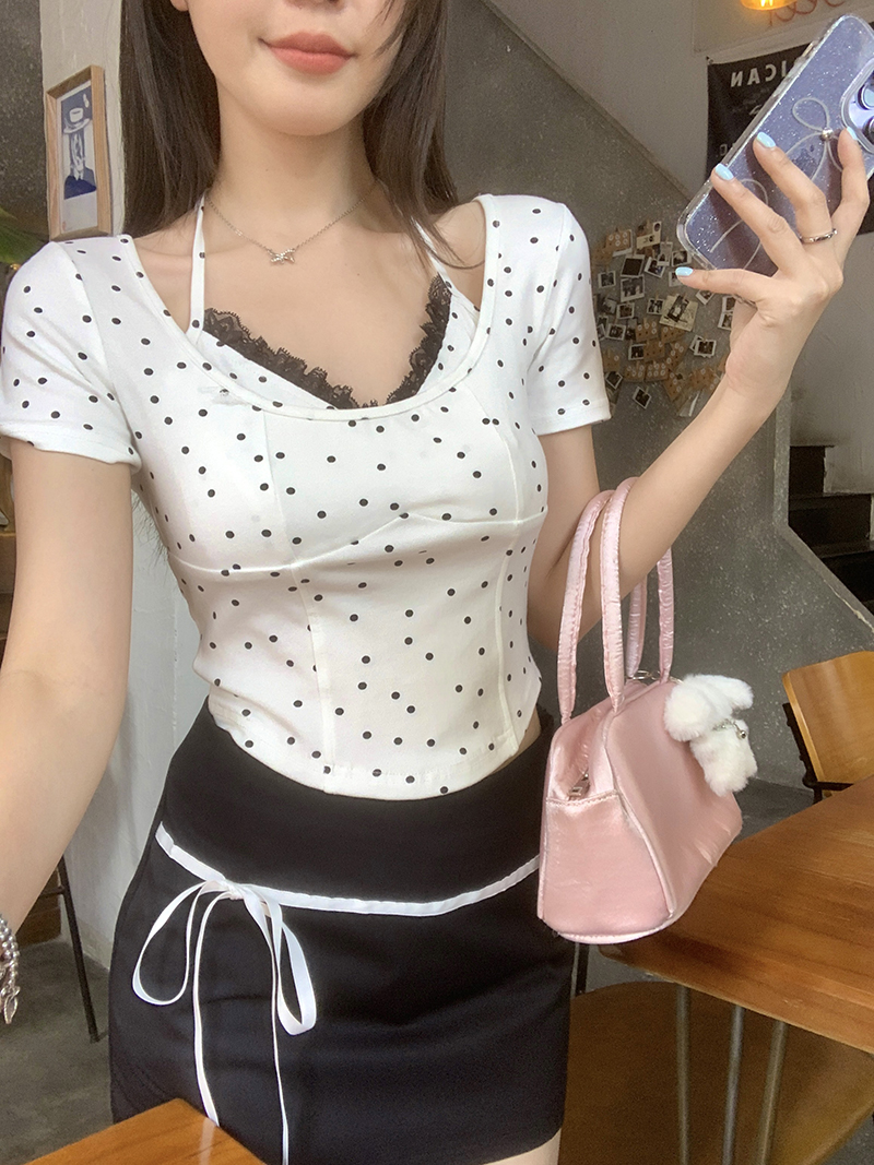 PF4535#夏装新款胖mm百搭显瘦蕾丝边波点吊带背心纯欲风上衣T恤女裝批發 服裝批發 服裝貨源