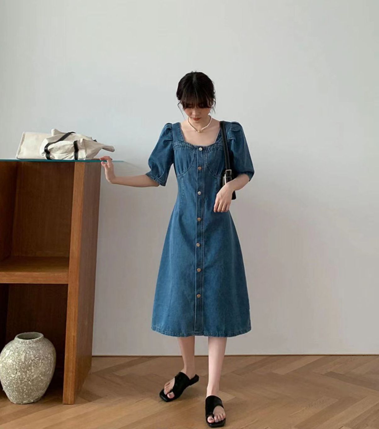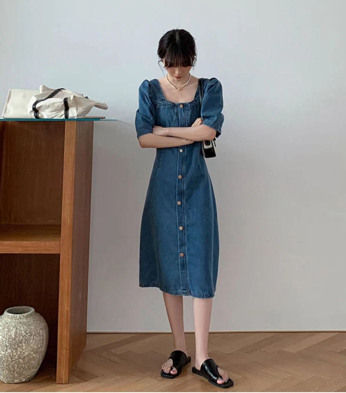 PF4552#夏装新款大码女装复古小众牛仔连衣裙设计感方领收腰气质轻熟长裙女裝批發 服裝批發 服裝貨源