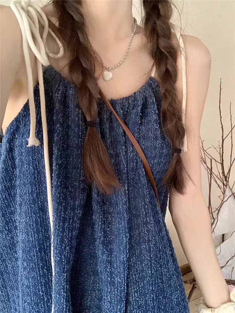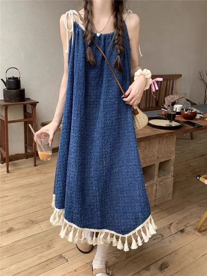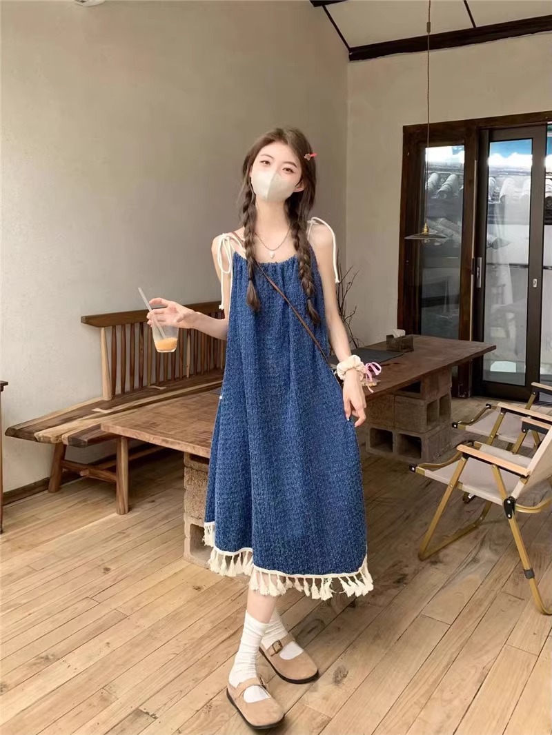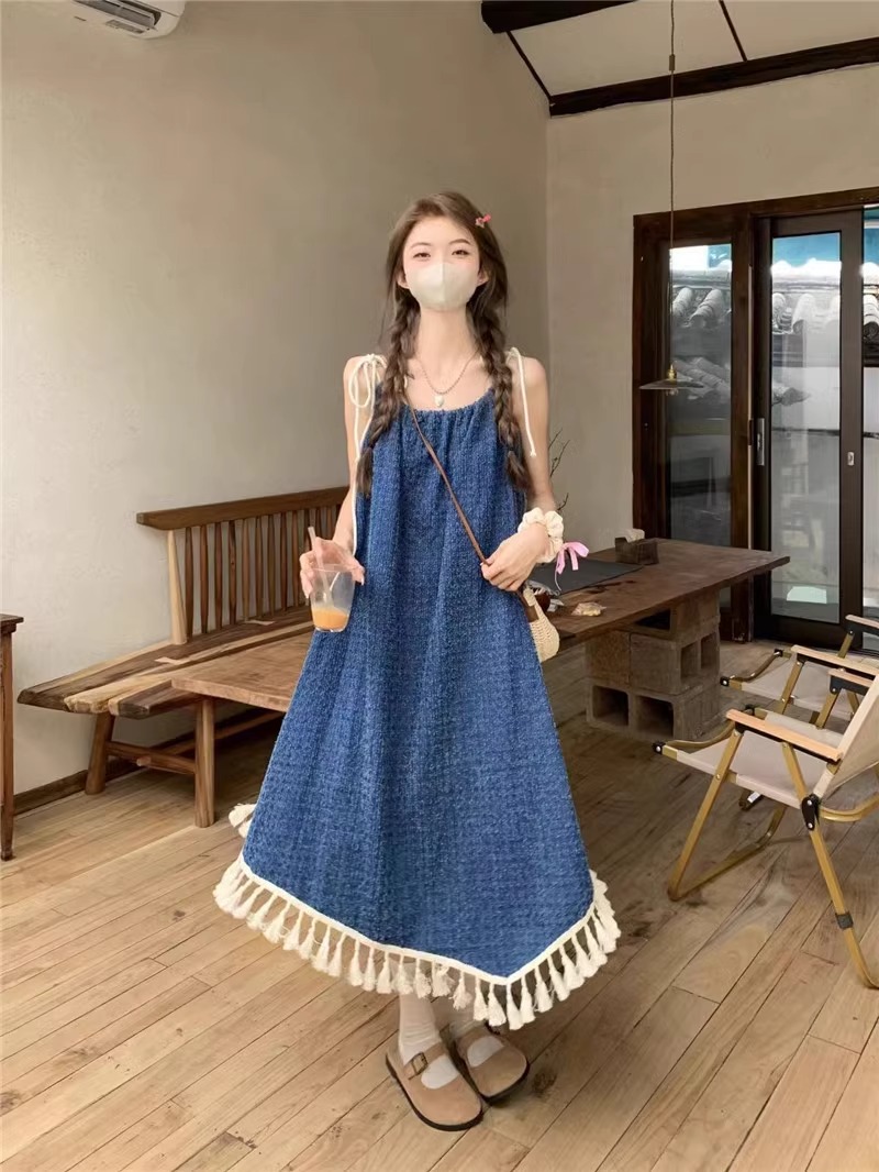 PF4558#夏装新款大码女装chic简约下摆流苏吊带牛仔连衣裙S-5XL200斤女裝批發 服裝批發 服裝貨源