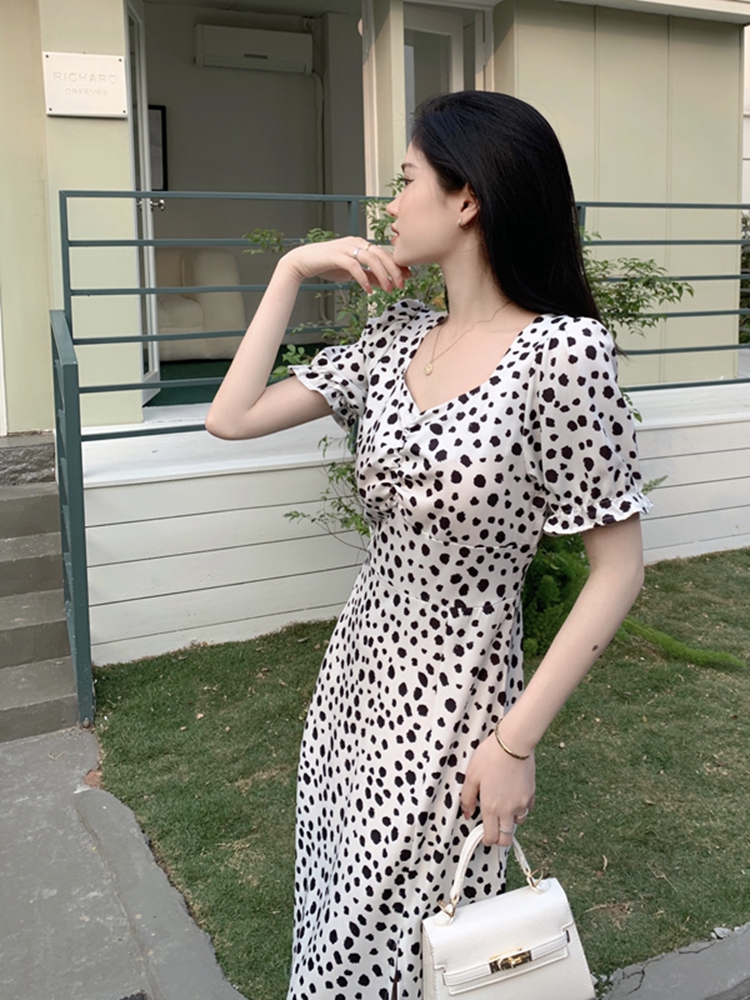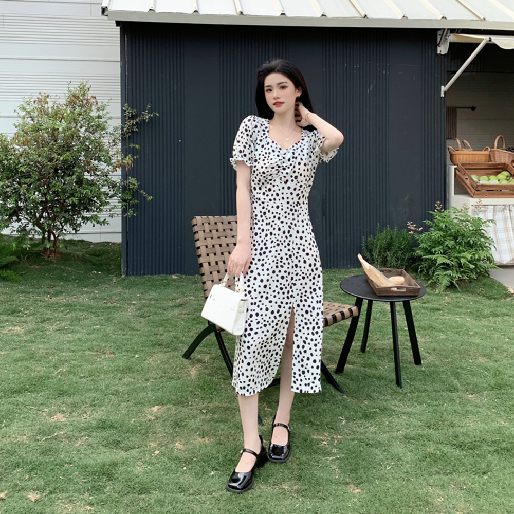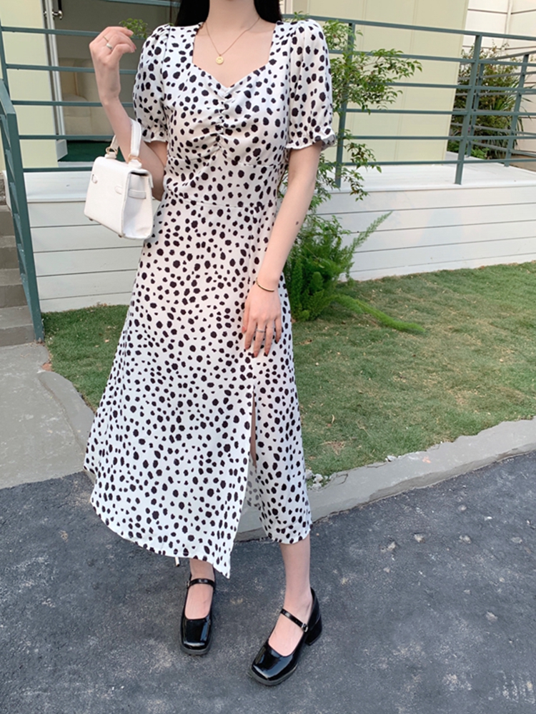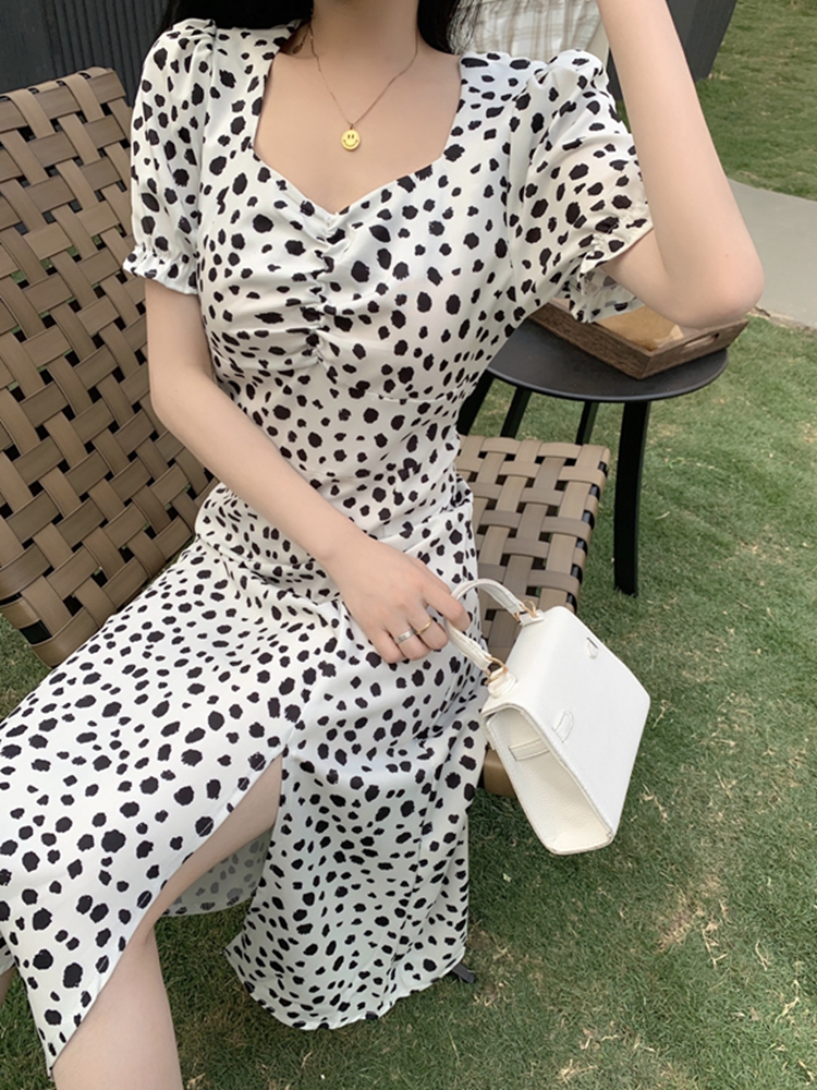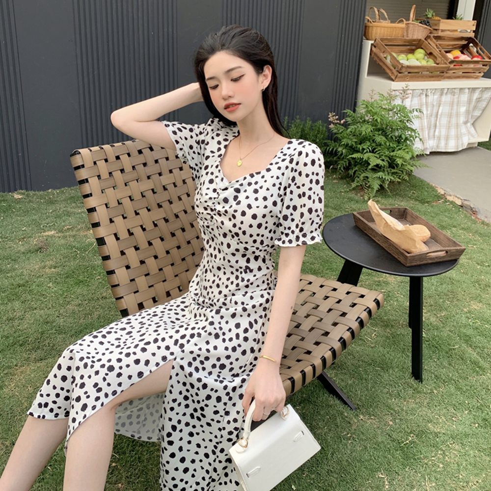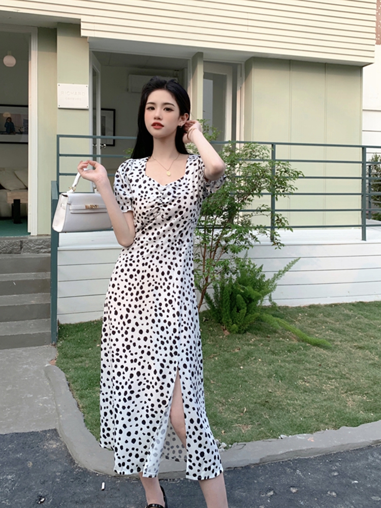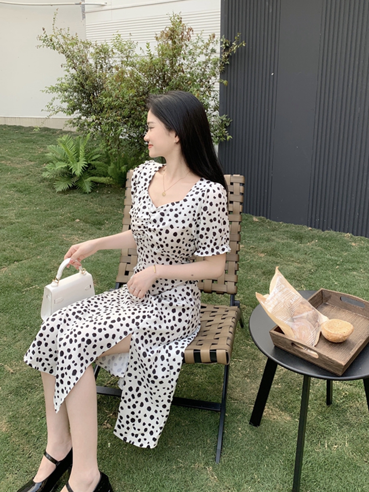 PF4559#大码女装白色波点法式连衣裙方领收腰裙性感开叉M-4XL200斤女裝批發 服裝批發 服裝貨源