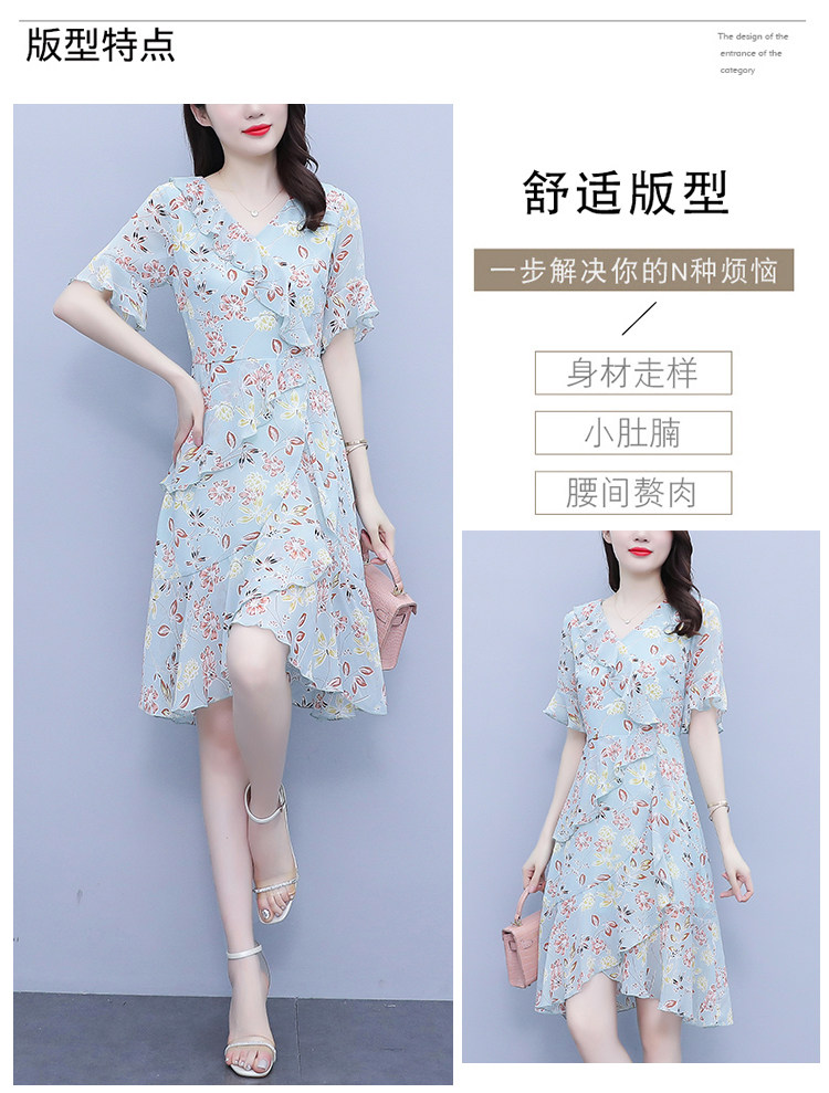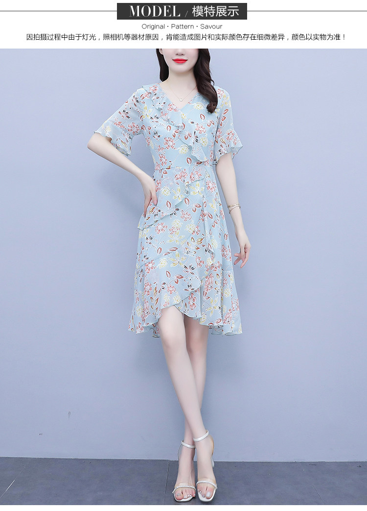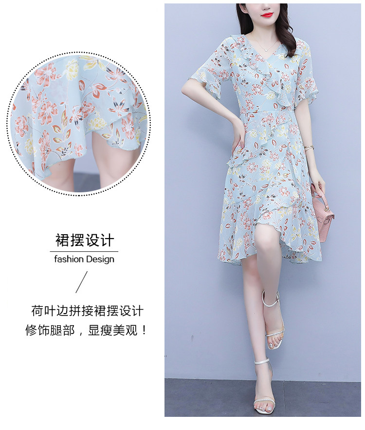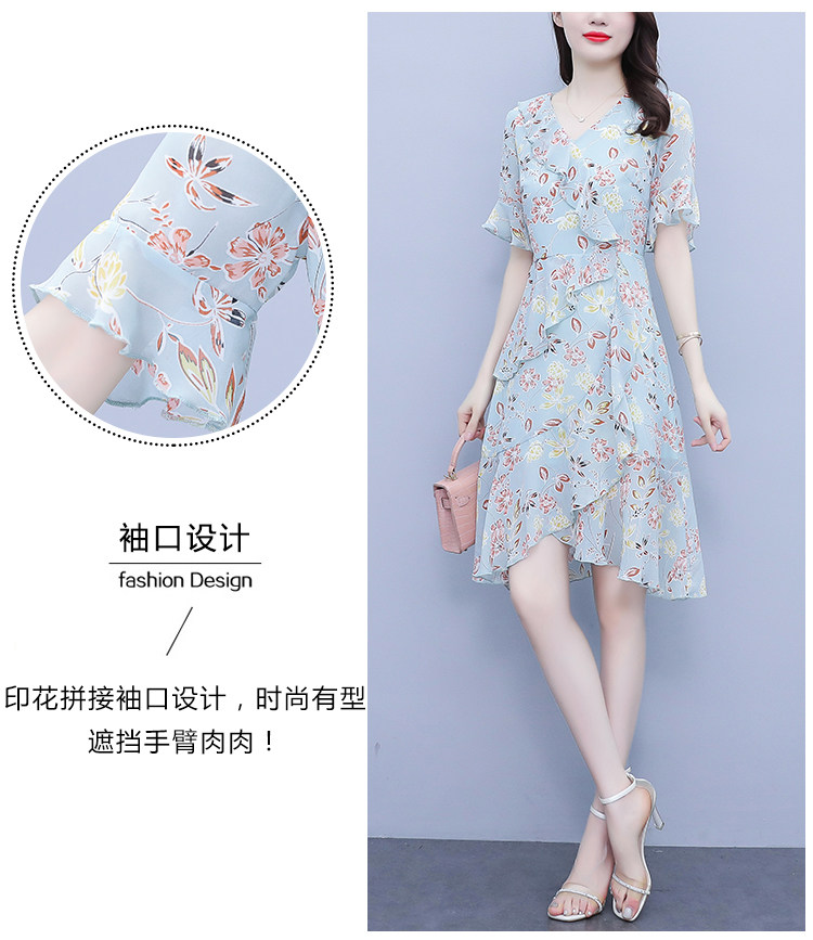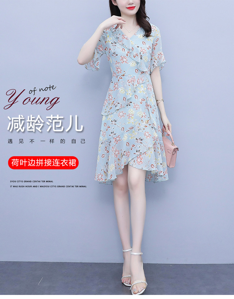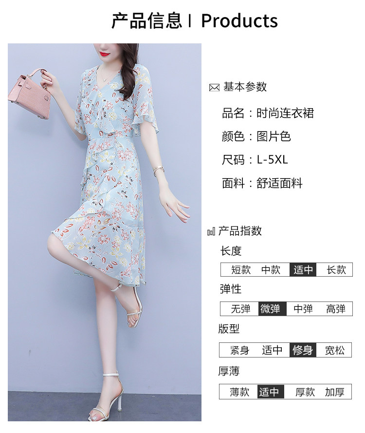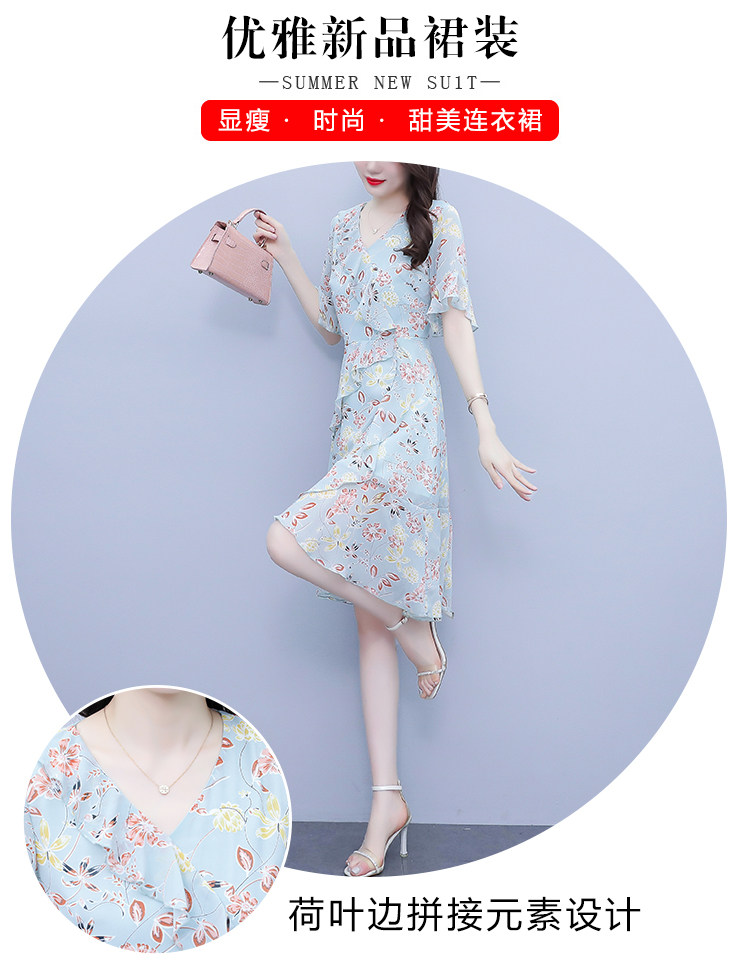 PF7153#大码女装夏季新款胖mm碎花雪纺V领荷叶边拼接连衣裙