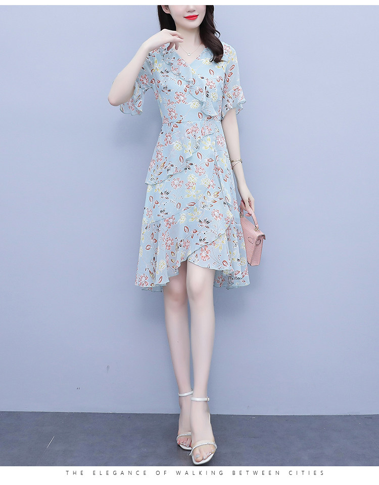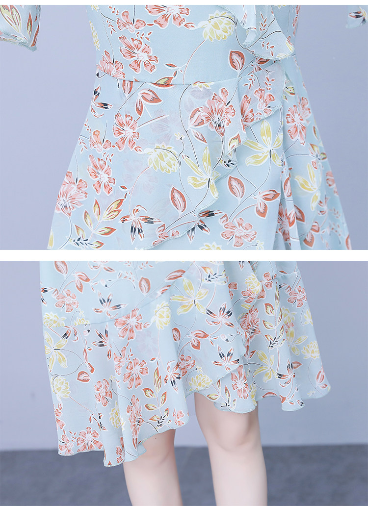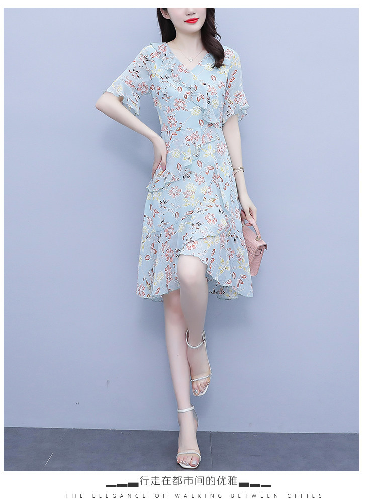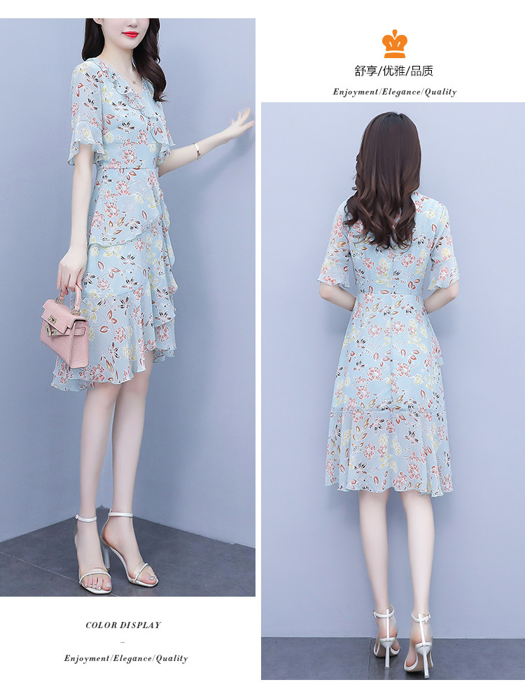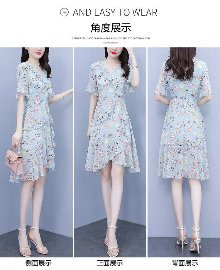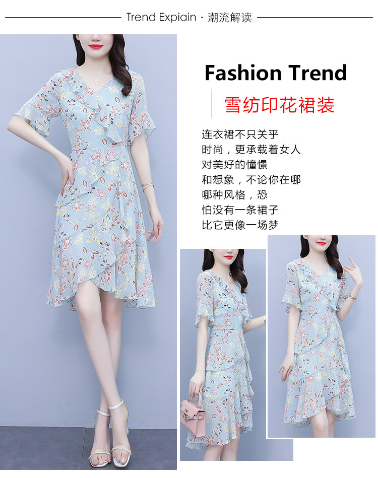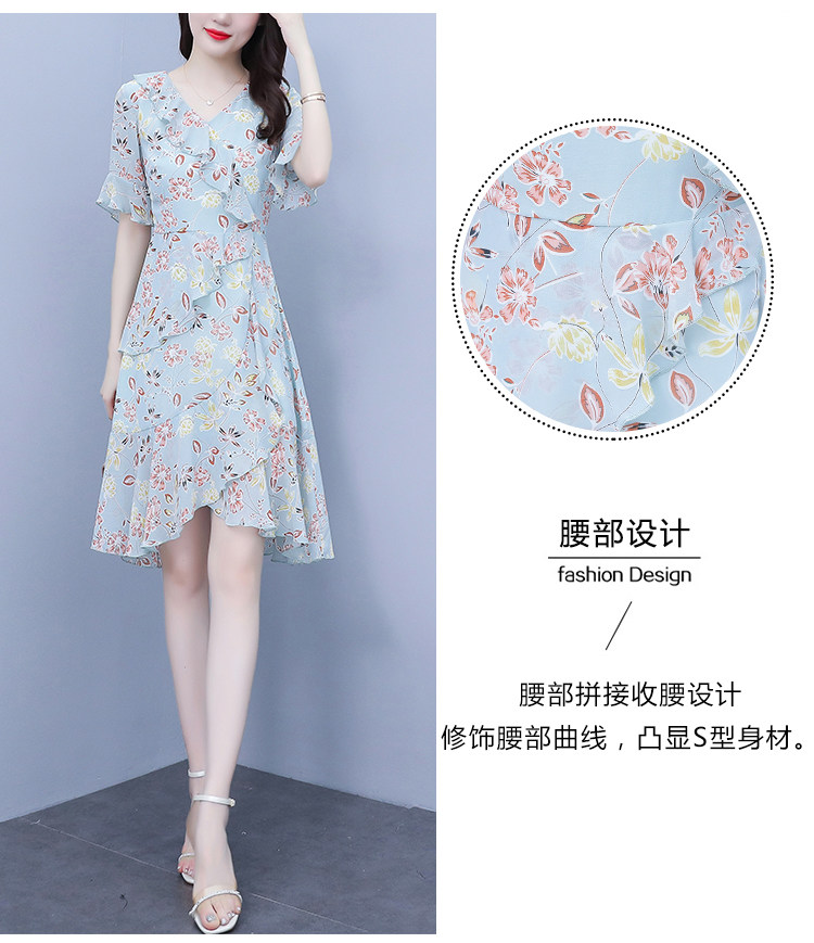 PF7153#大码女装夏季新款胖mm碎花雪纺V领荷叶边拼接连衣裙