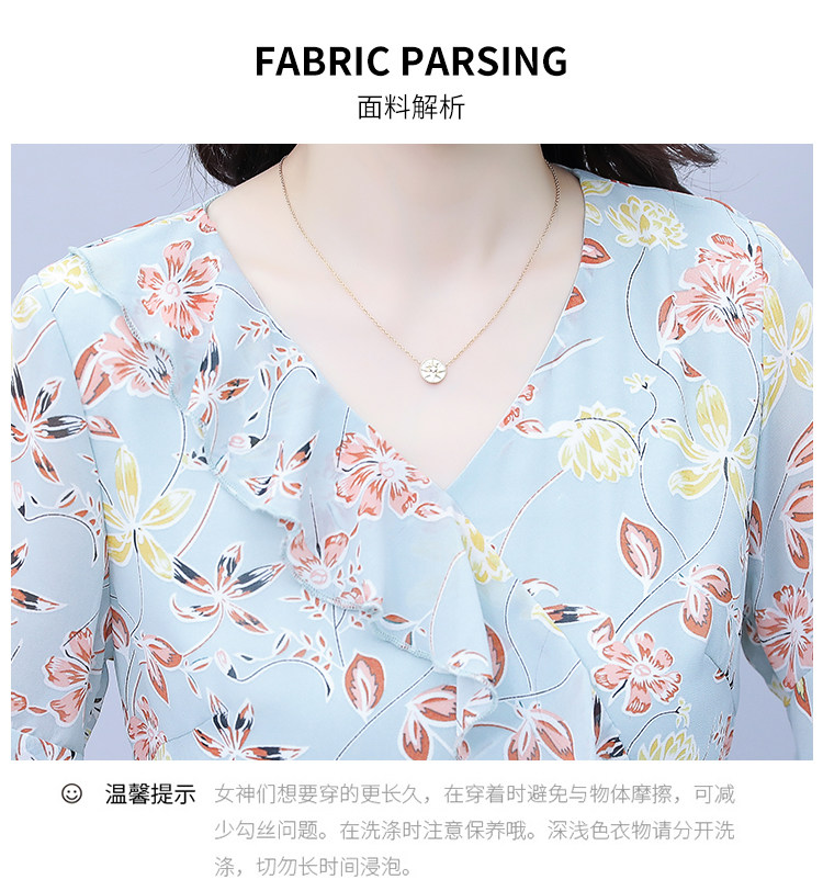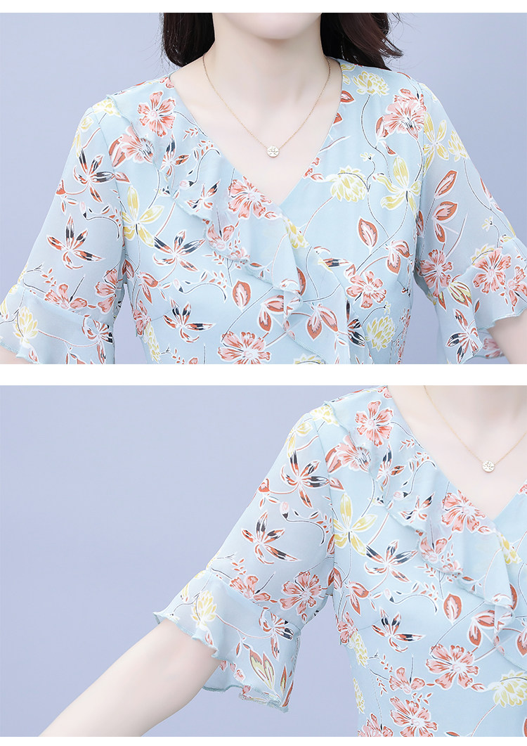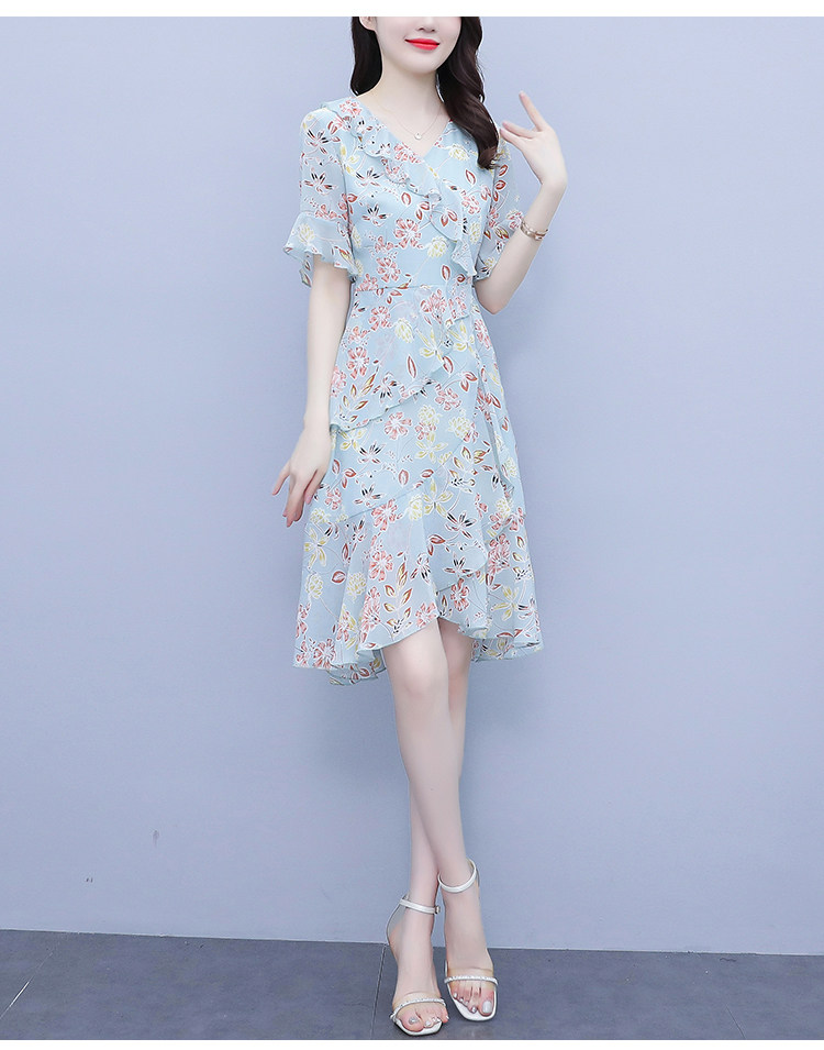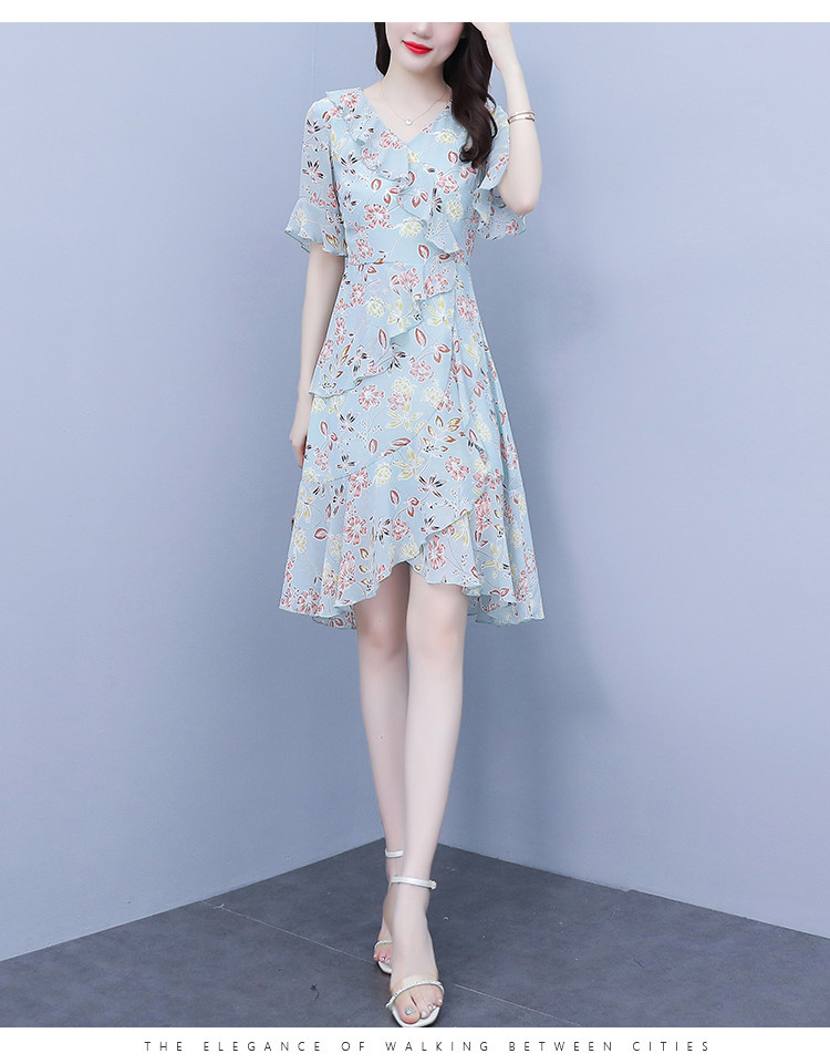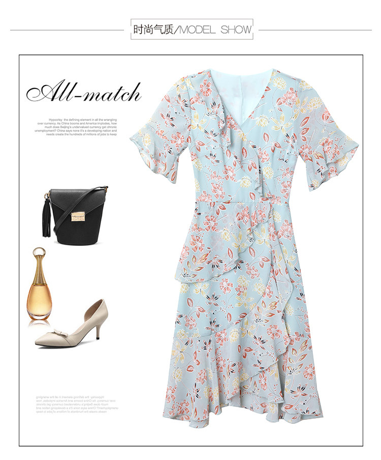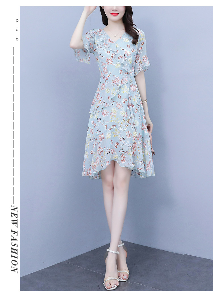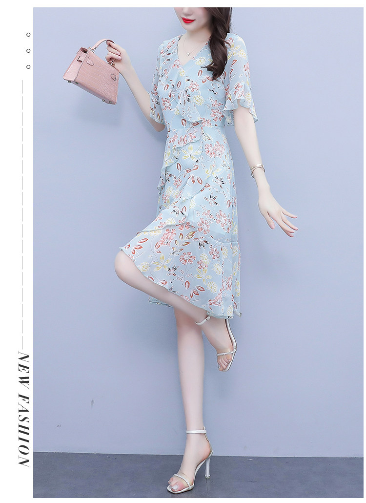 PF7153#大码女装夏季新款胖mm碎花雪纺V领荷叶边拼接连衣裙