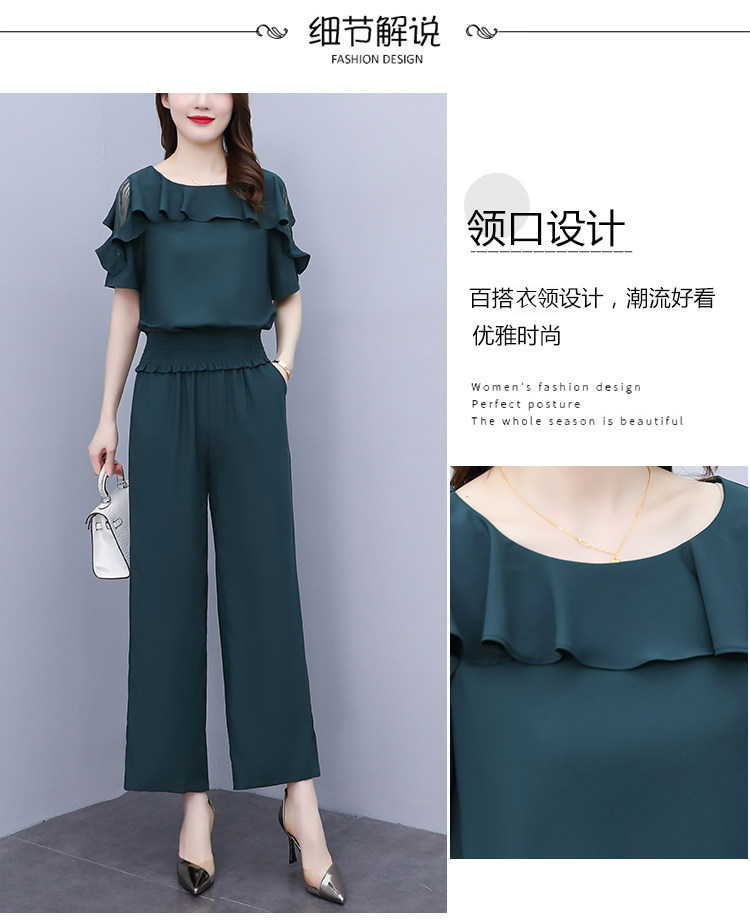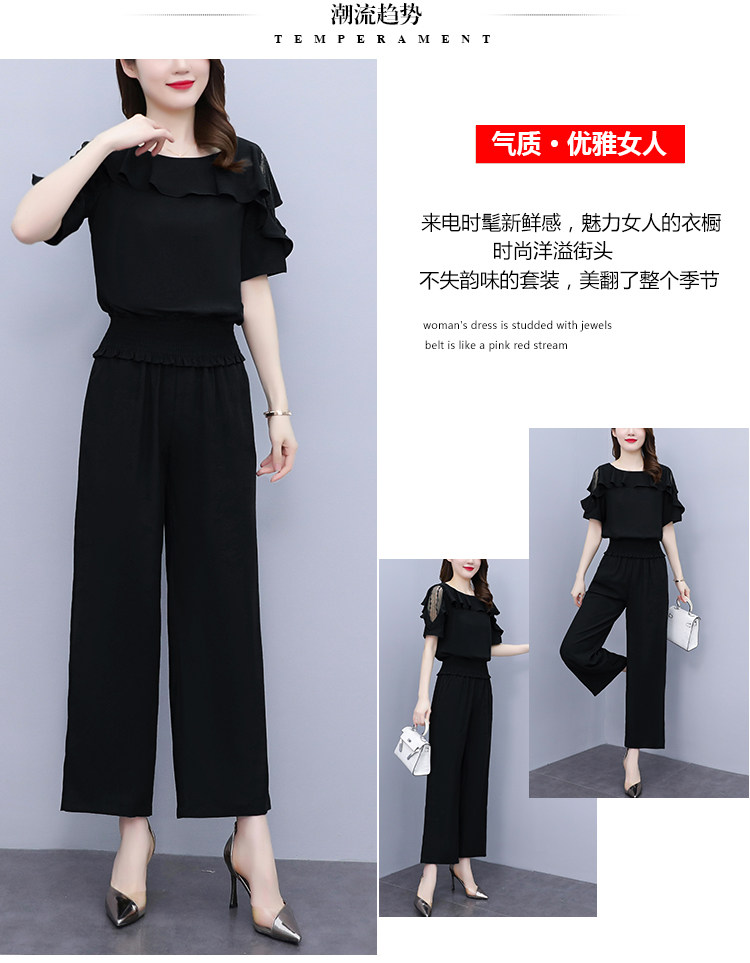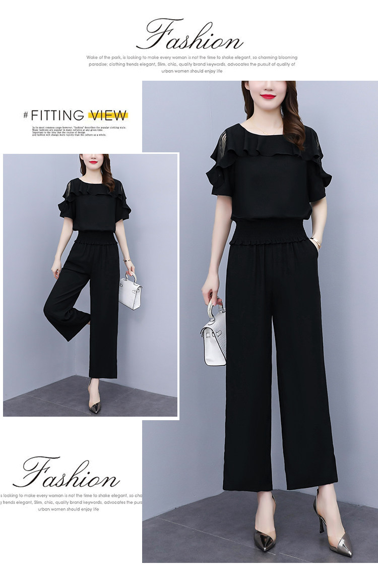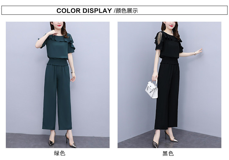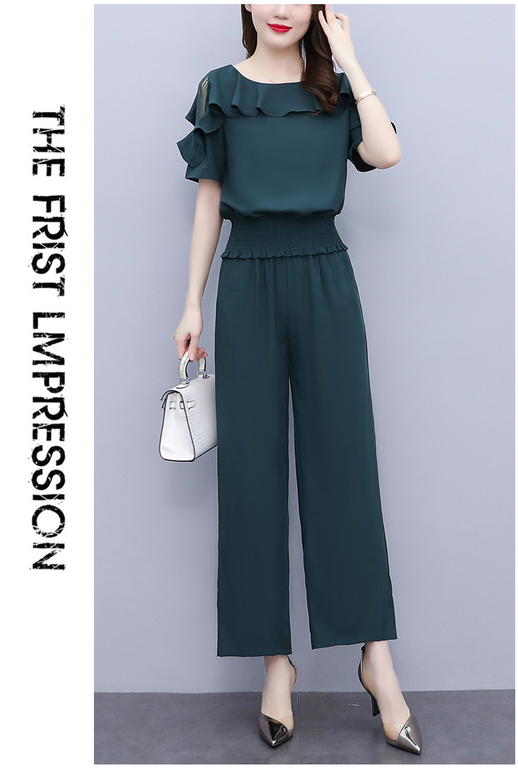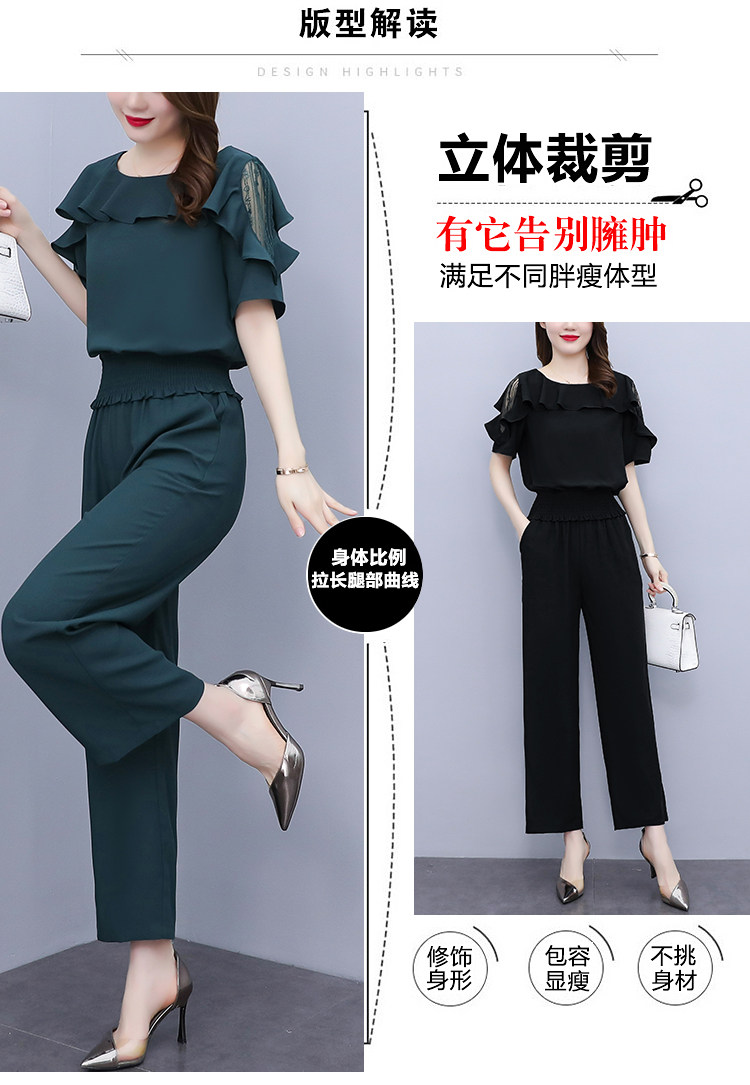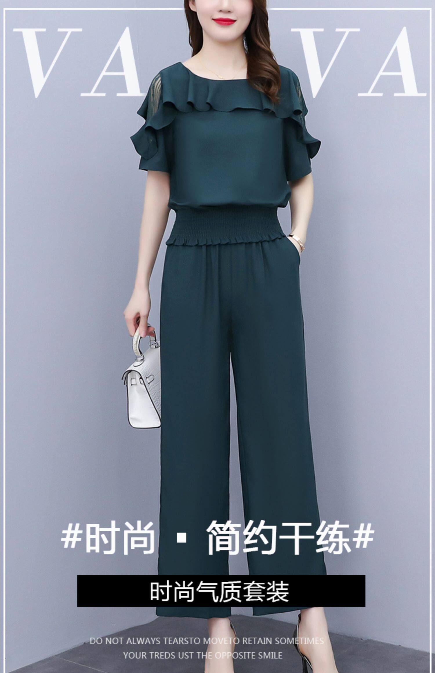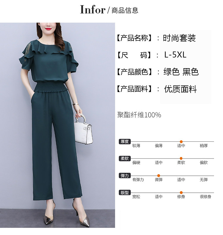 PF7219#胖mm夏季新款圆领纯色大码套装短袖时尚通勤高腰长裤两件套