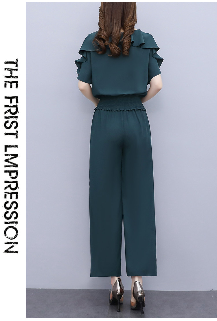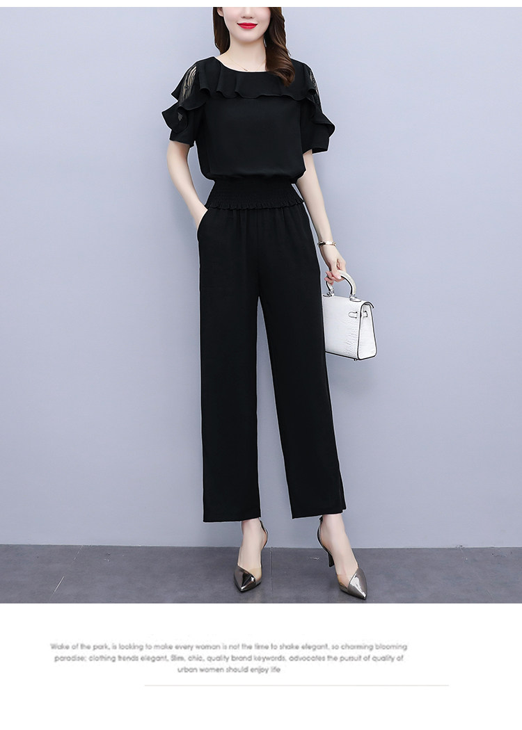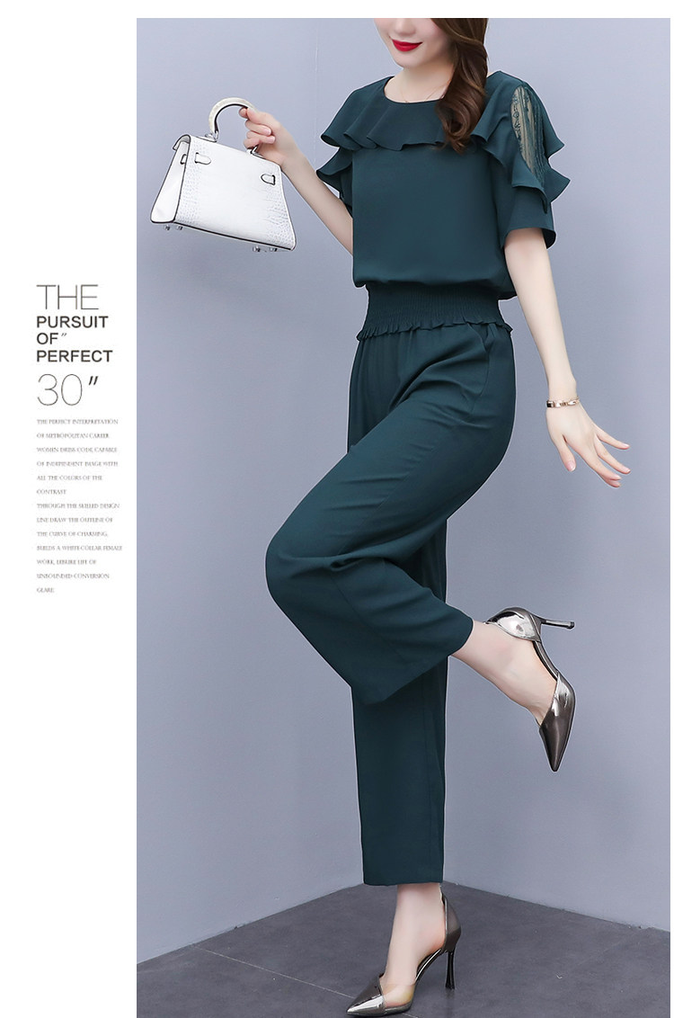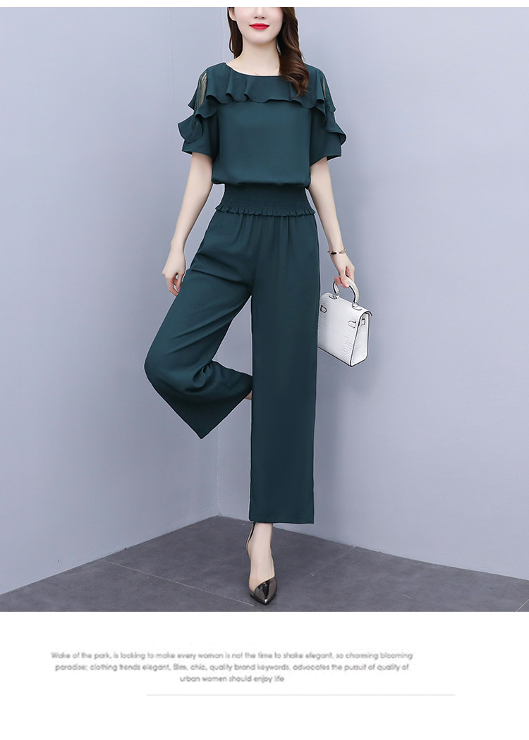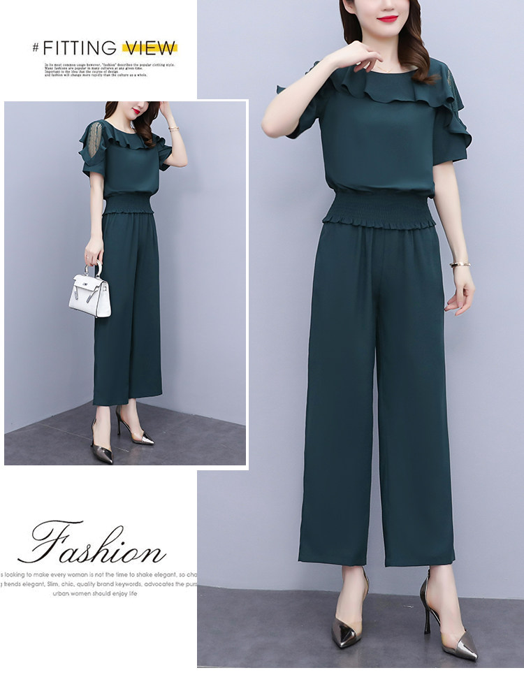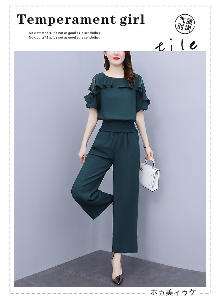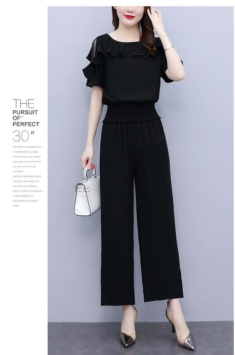 PF7219#胖mm夏季新款圆领纯色大码套装短袖时尚通勤高腰长裤两件套