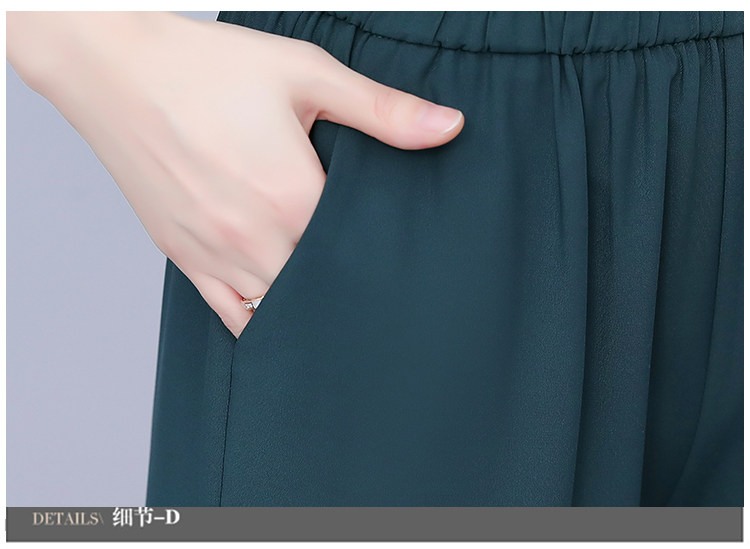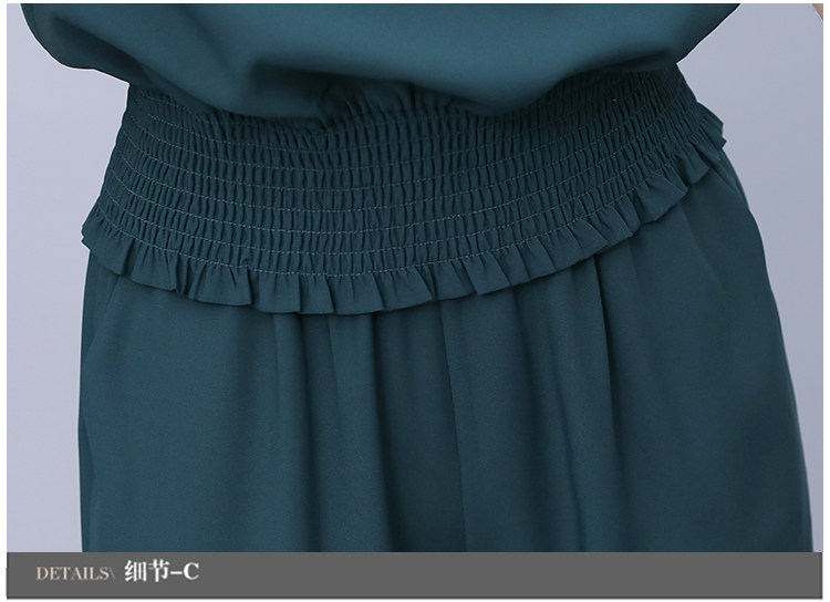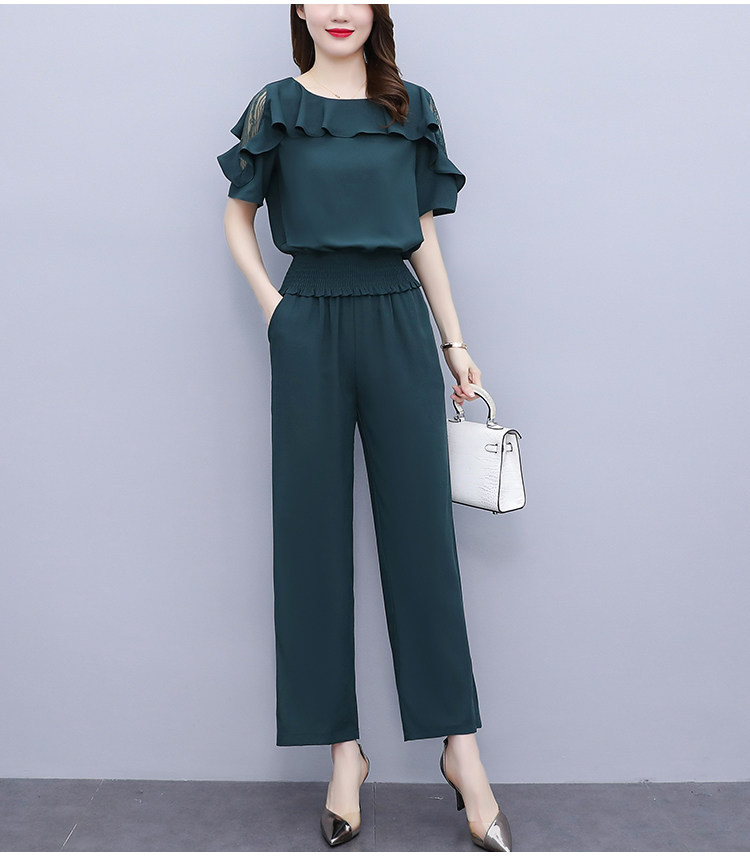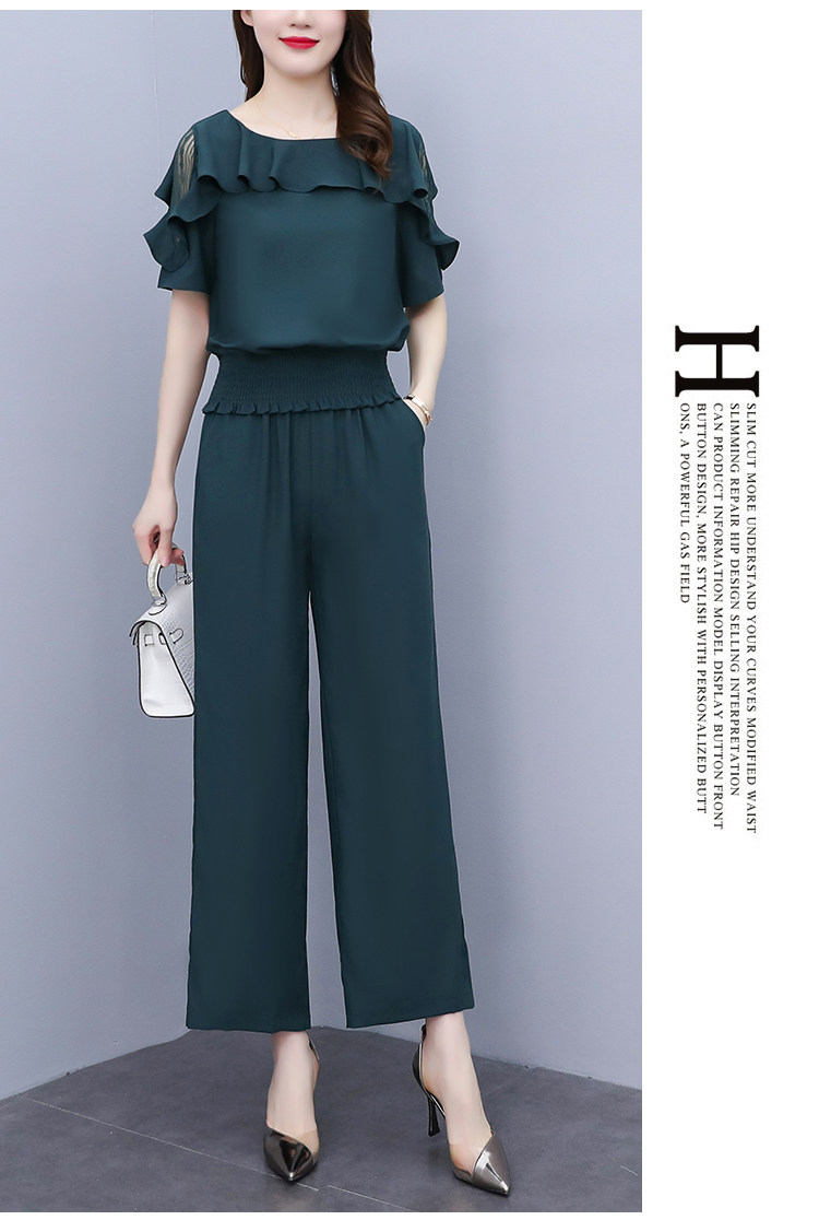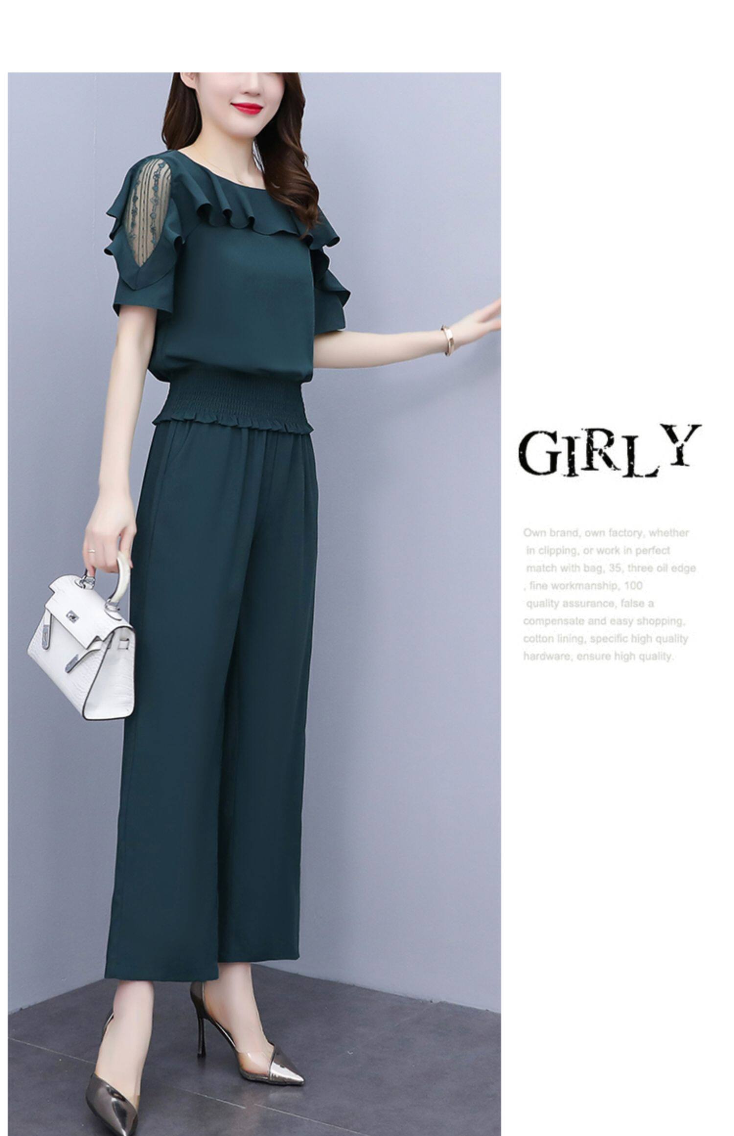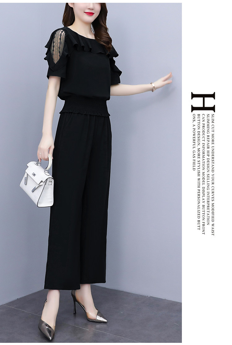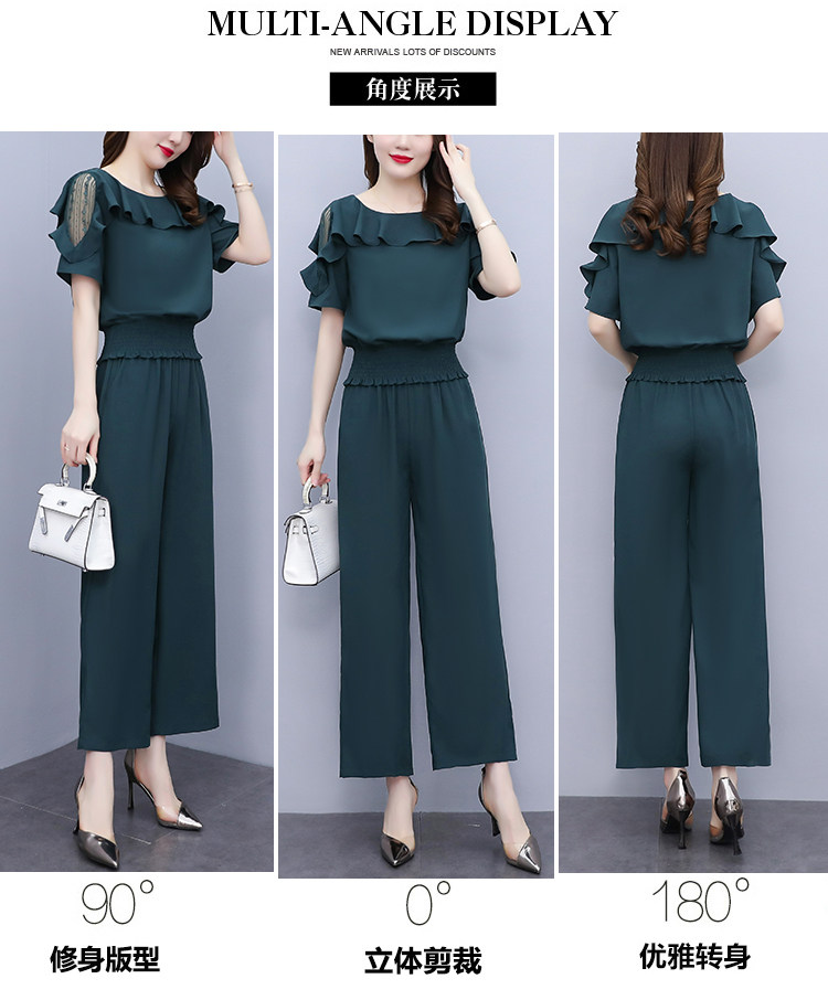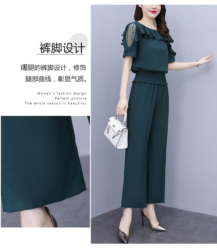 PF7219#胖mm夏季新款圆领纯色大码套装短袖时尚通勤高腰长裤两件套