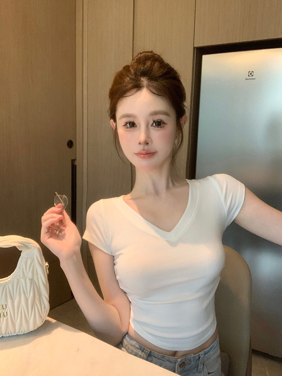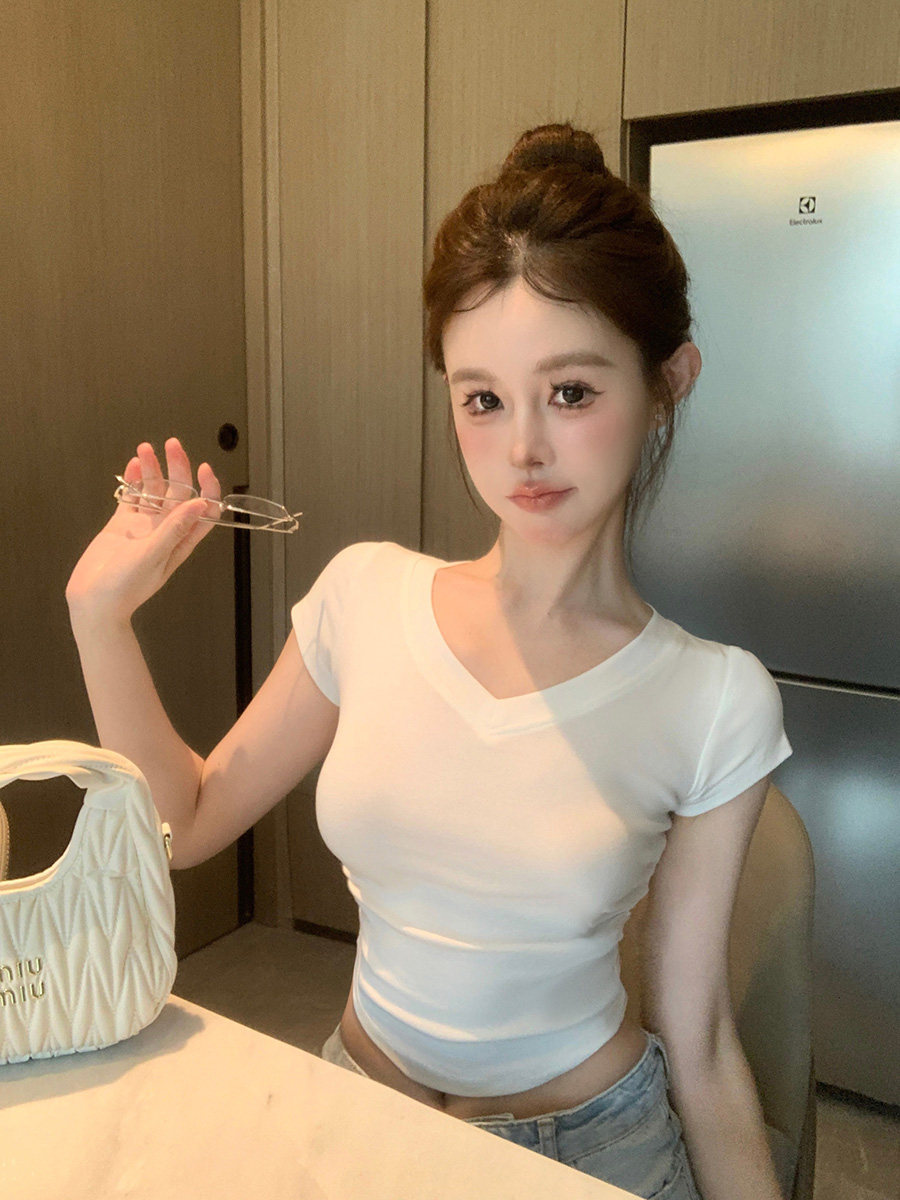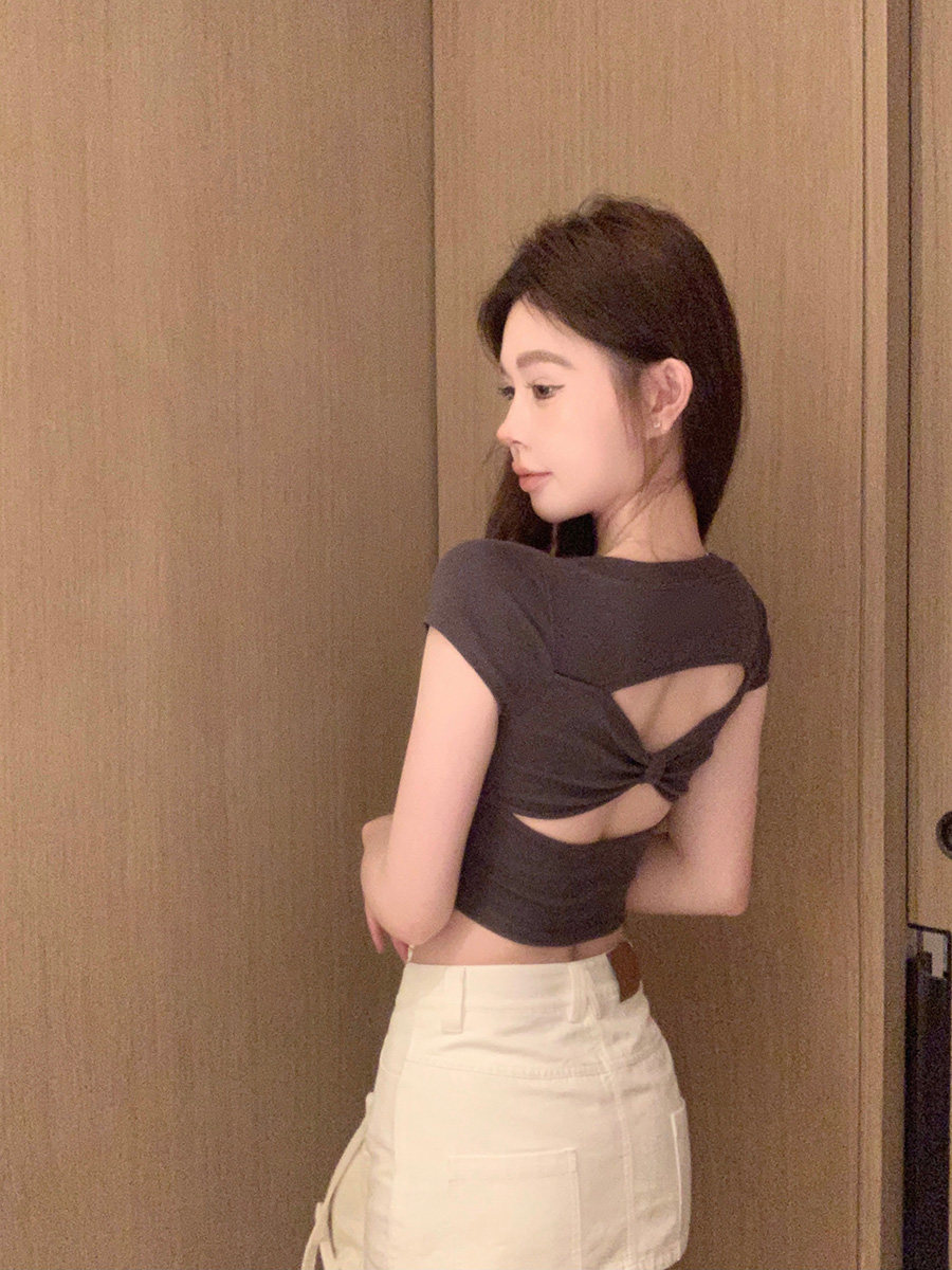 PF10739#露背V领短袖T恤女短款辣妹上衣女裝貨源服裝批發