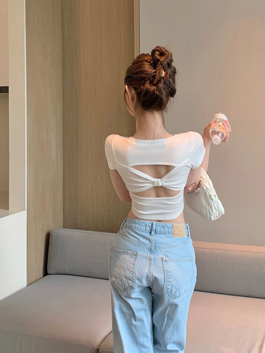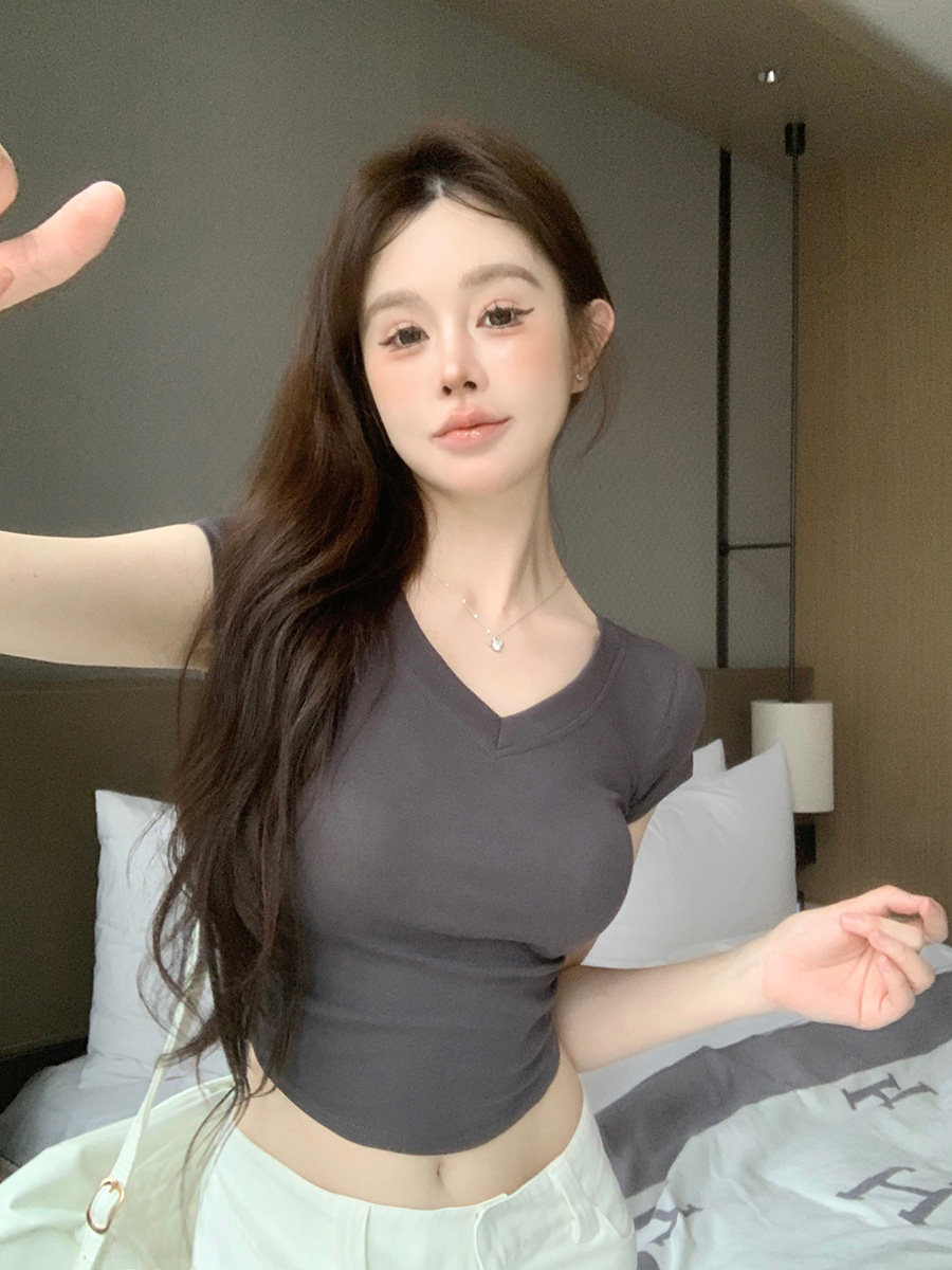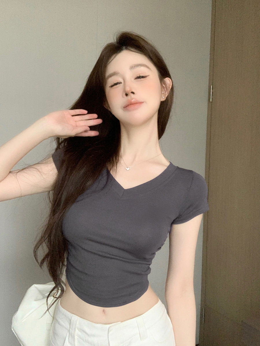 PF10739#露背V领短袖T恤女短款辣妹上衣女裝貨源服裝批發