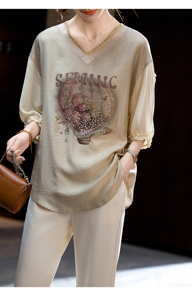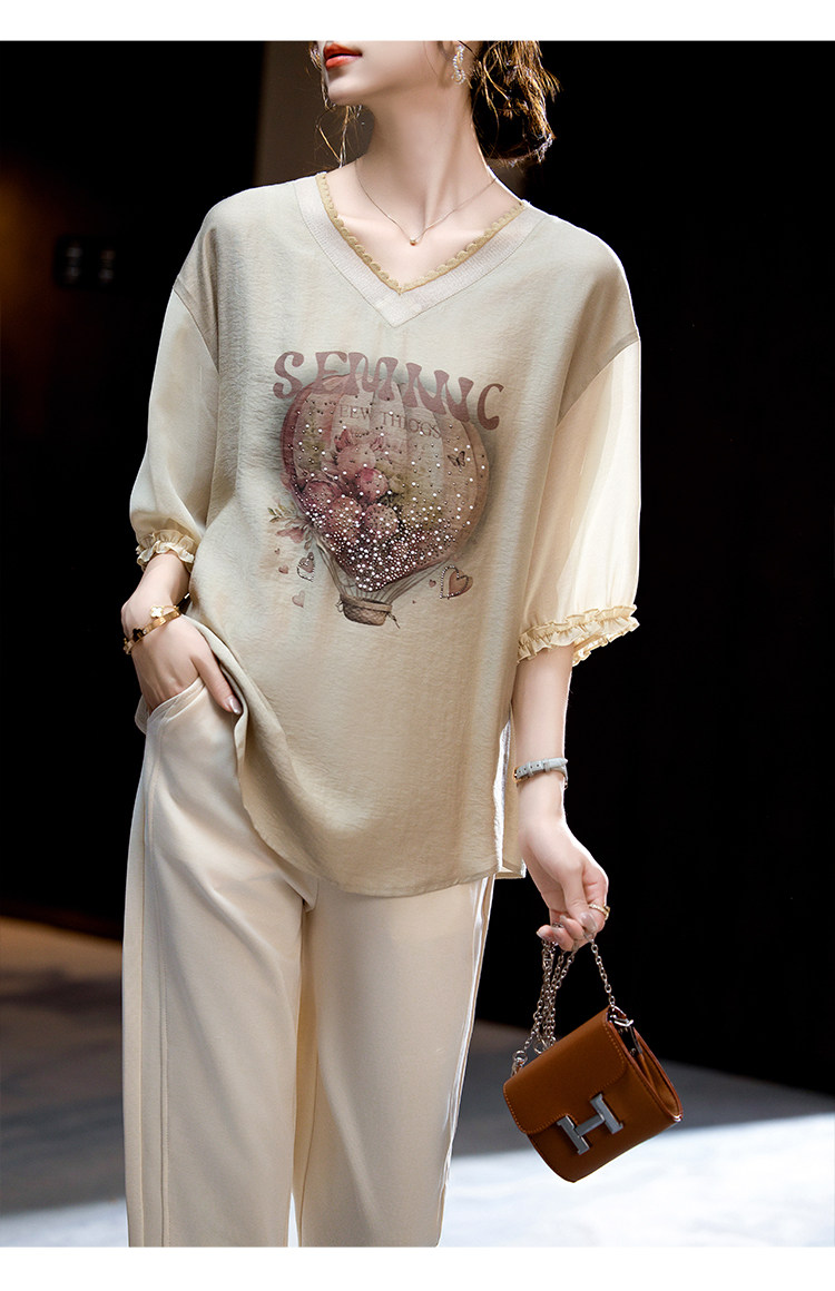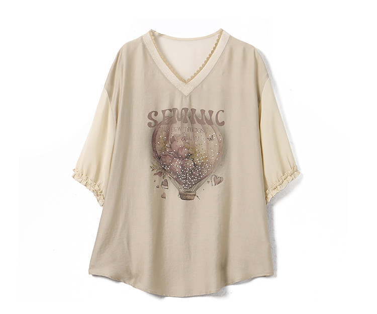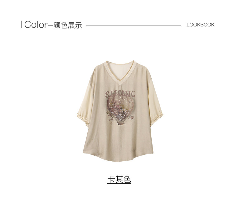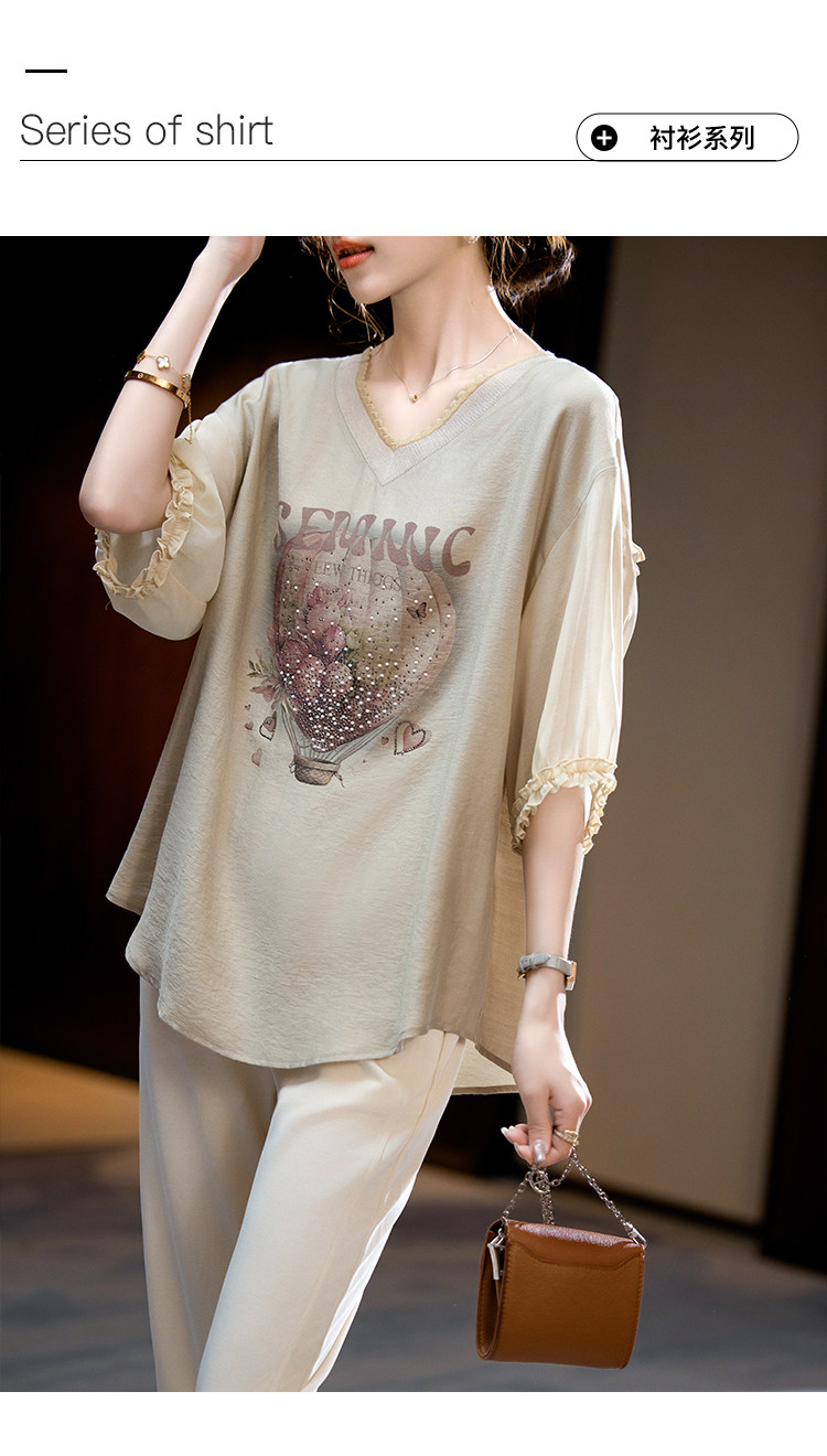 PF11081#衣品乐烫钻印花v领短袖衬衫女夏季2024新款宽松大码上衣洋气小衫女裝貨源服裝批發
