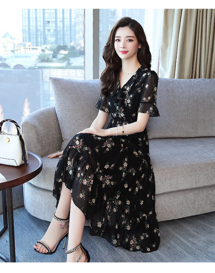 PF29432#夏装新款宽松显瘦娃娃领黑色碎花中长裙荷叶袖气质雪纺连衣裙女裝貨源服裝批發