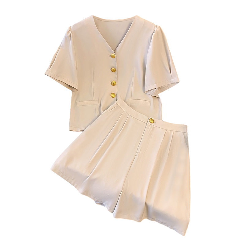 MY3038# 大码女装夏季胖mm简约气质休闲V领上衣遮肚短裤显瘦套装女裝貨源服裝批發