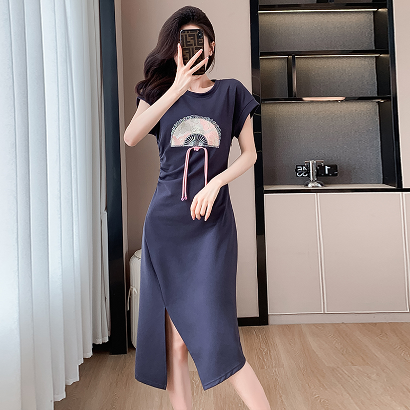 MY3122# 轻中式设计感收腰开叉连衣裙女夏新时尚轻奢遮肉减龄显瘦长裙女裝貨源服裝批發