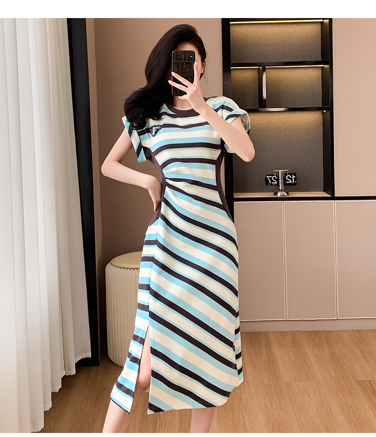 MY3124# 高级感定制款夏季轻奢气质条纹港风收褶设计显瘦连衣裙女女裝貨源服裝批發