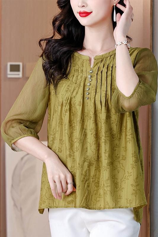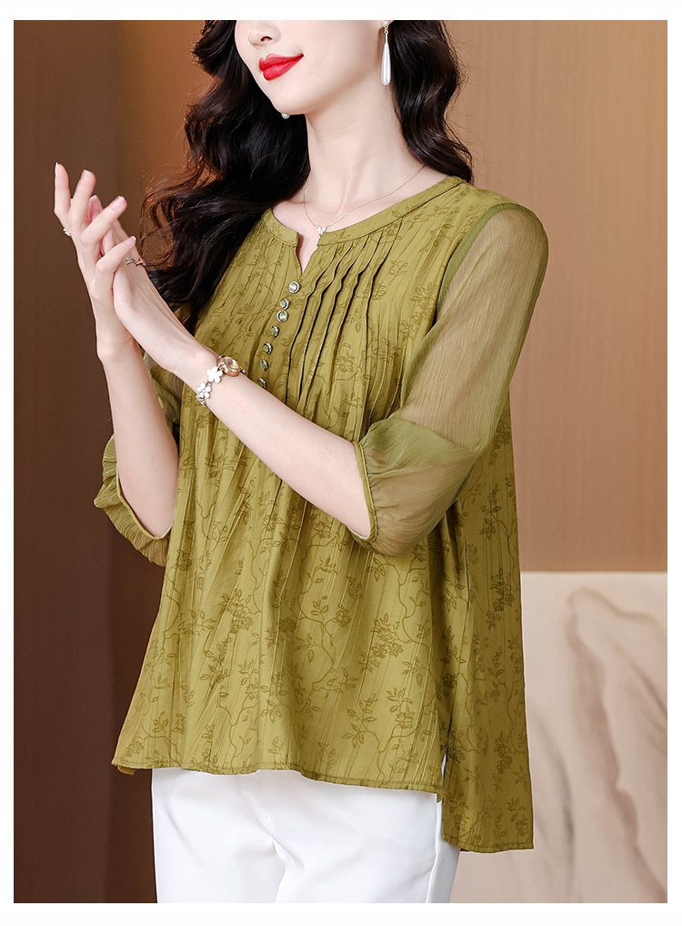 MY4843# 新款大码女装优雅气质洋气七分袖小衫印花压褶女上衣女裝貨源服裝批發