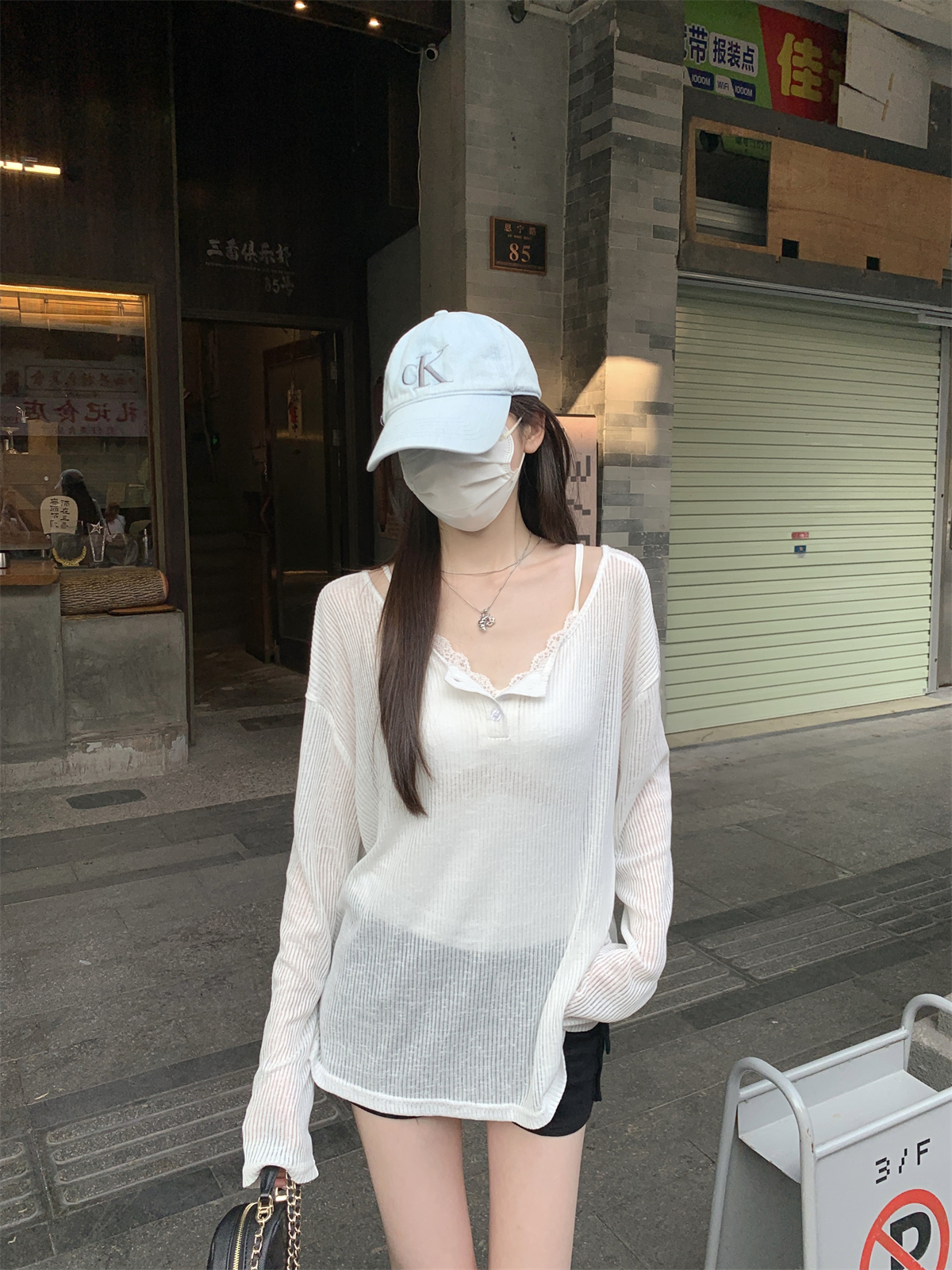 MY5154# 韩版宽松纽扣后背绑带设计天丝防晒罩衫长袖T恤上衣女裝貨源服裝批發