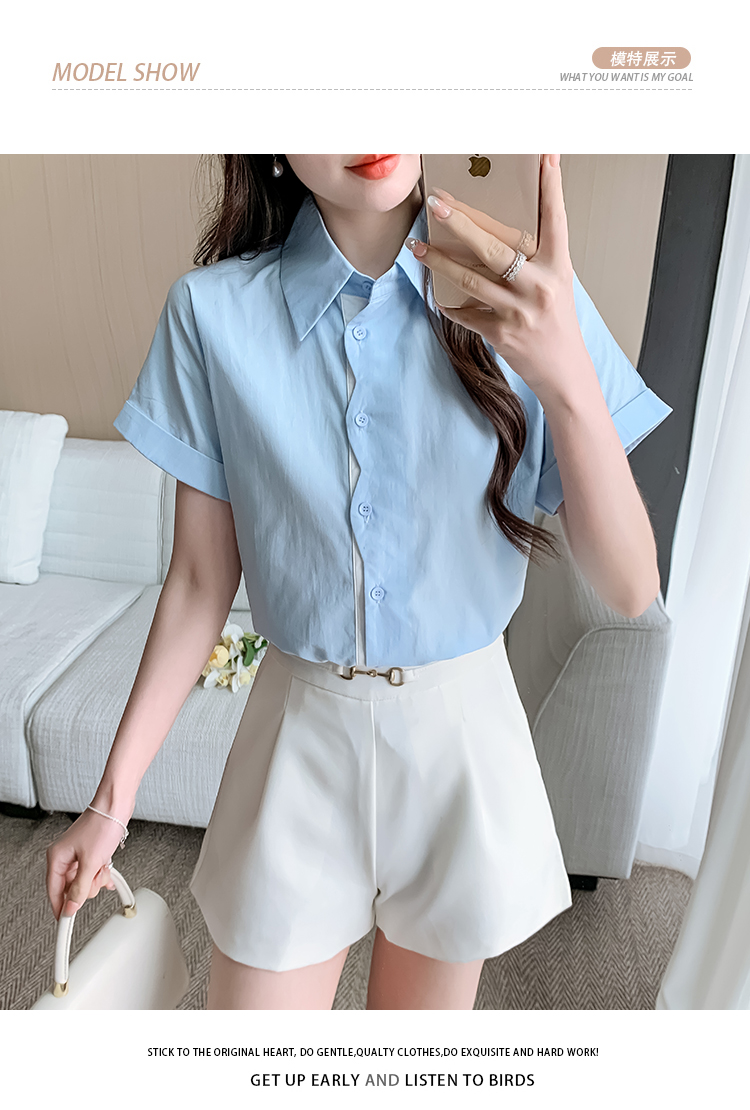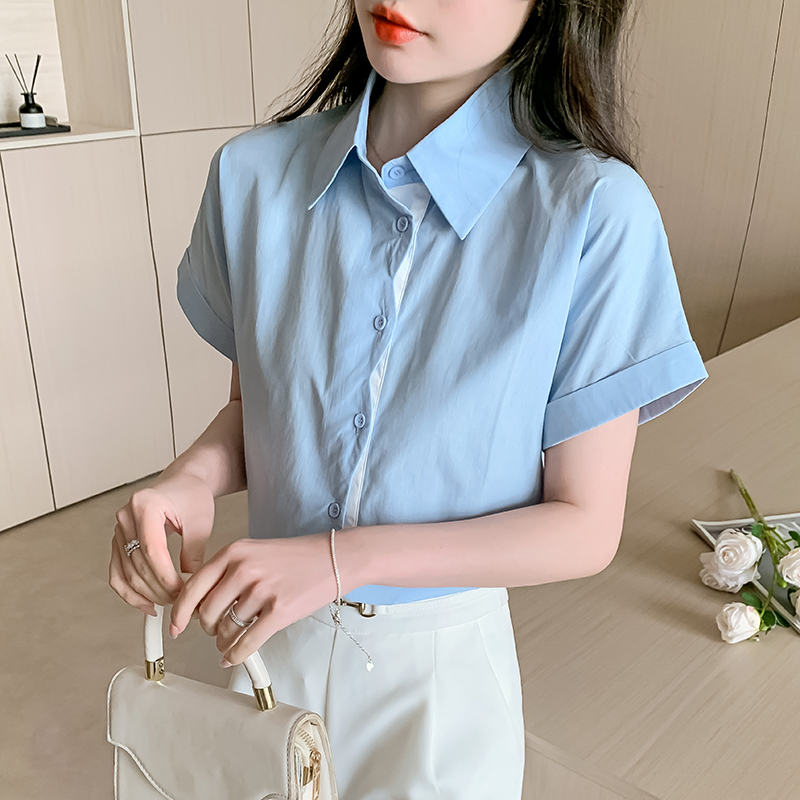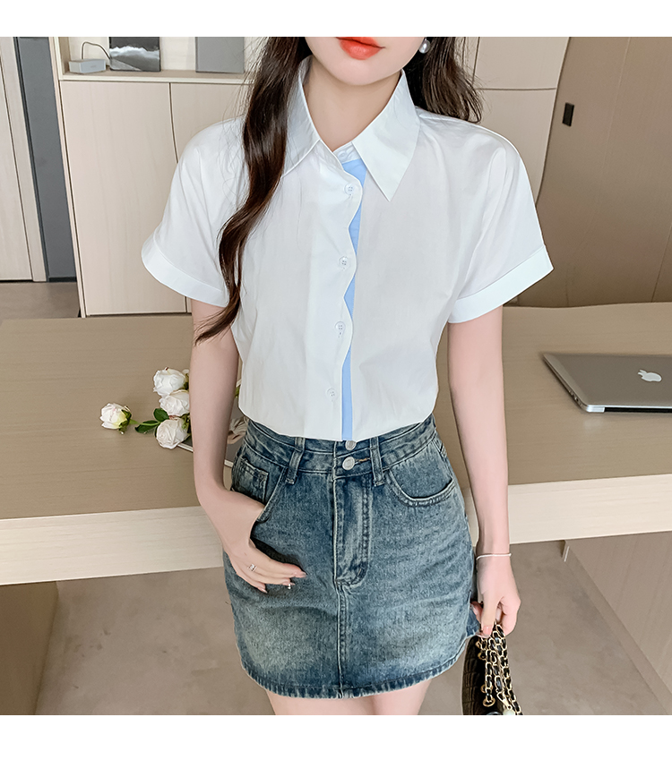 MY5229# 夏季新款纯棉衬衫设计感撞色门襟宽松短袖上衣女裝貨源服裝批發