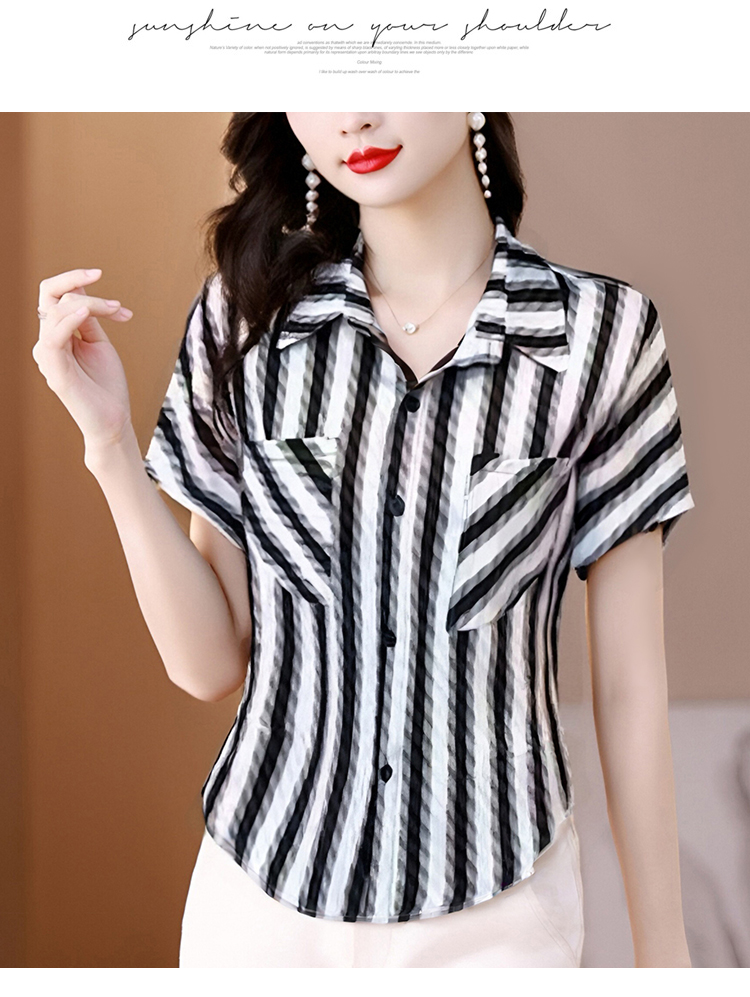 MY5240# 新款时尚韩版条纹衬衫气质洋气雪纺衫短袖女女裝貨源服裝批發
