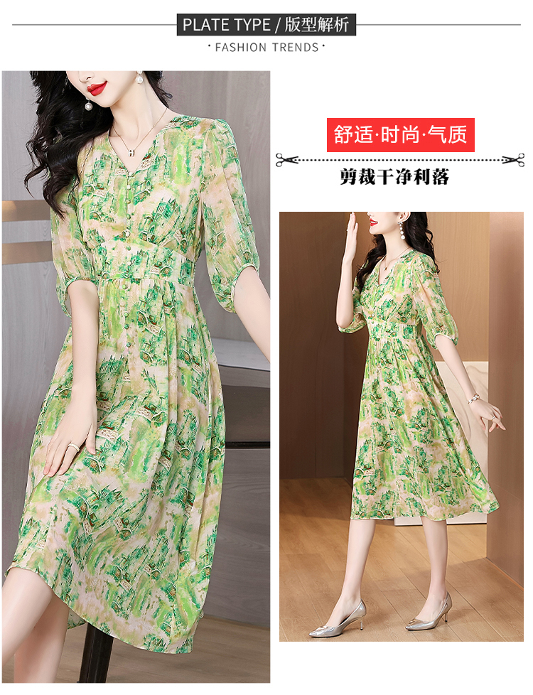 MY5316# 显气质收腰真丝长裙新款v领印花法式优雅桑蚕丝连衣裙女裝貨源服裝批發