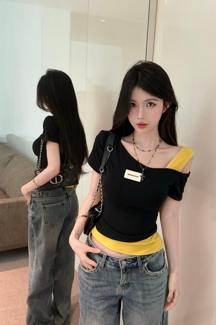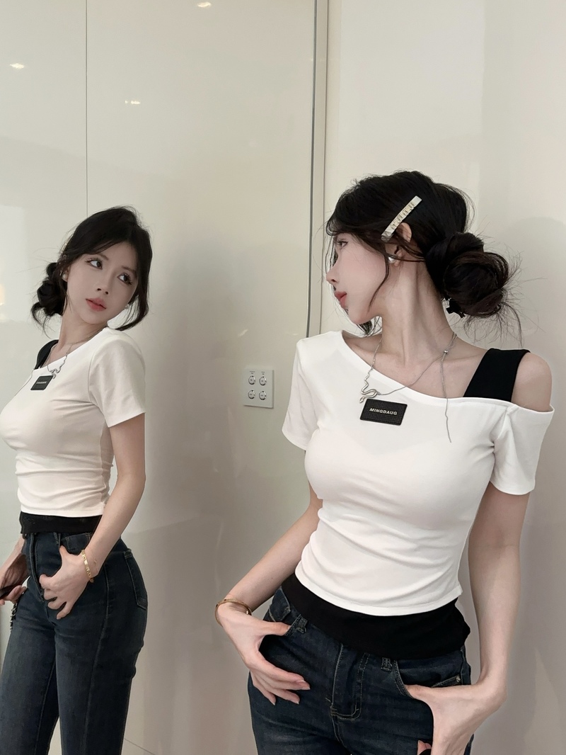 MY5380# 新款撞色斜肩百搭时尚T恤上衣女潮女裝貨源服裝批發