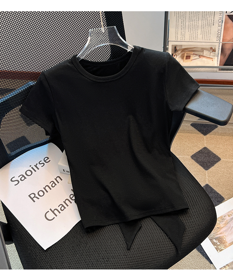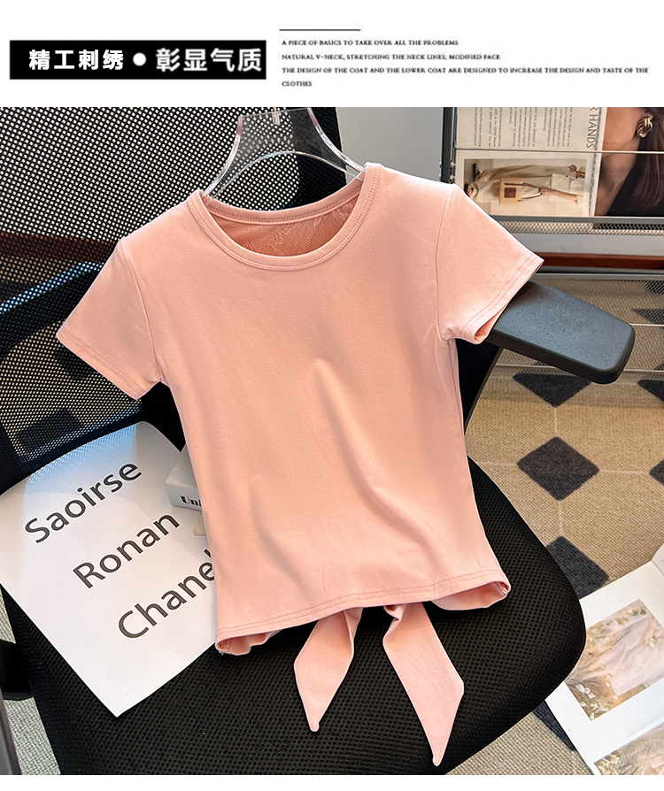 MY5446# 别致甜辣妹蕾丝拼接蝴蝶结露背短款上衣设计感修身短袖t恤女女裝貨源服裝批發