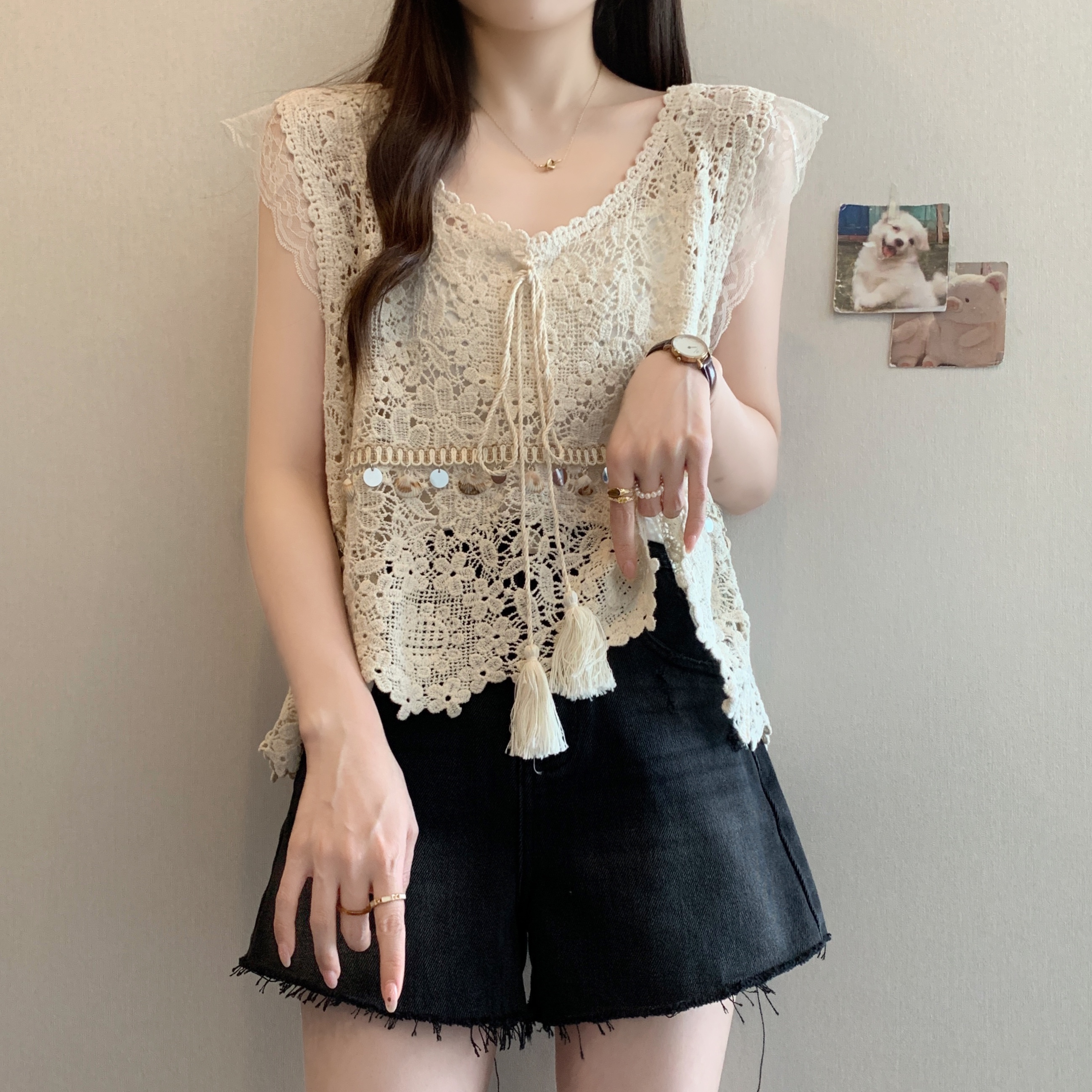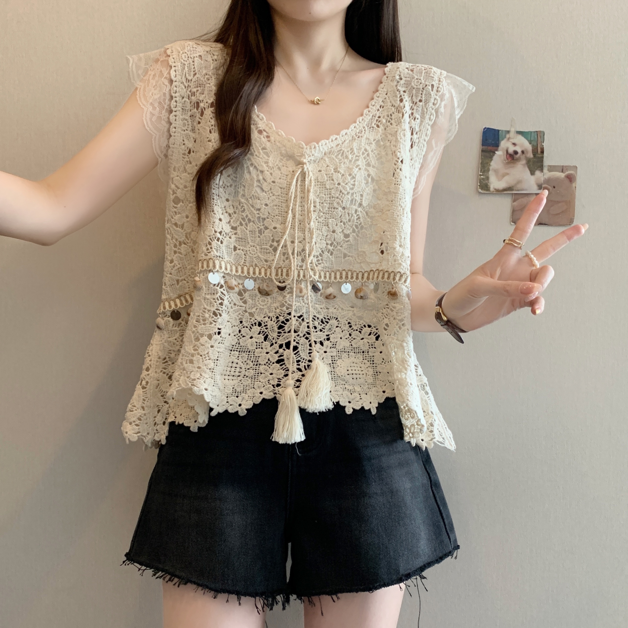 MY5513# 夏季新款韩版蕾丝镂空钩花流苏系带背心外搭罩衫女裝貨源服裝批發