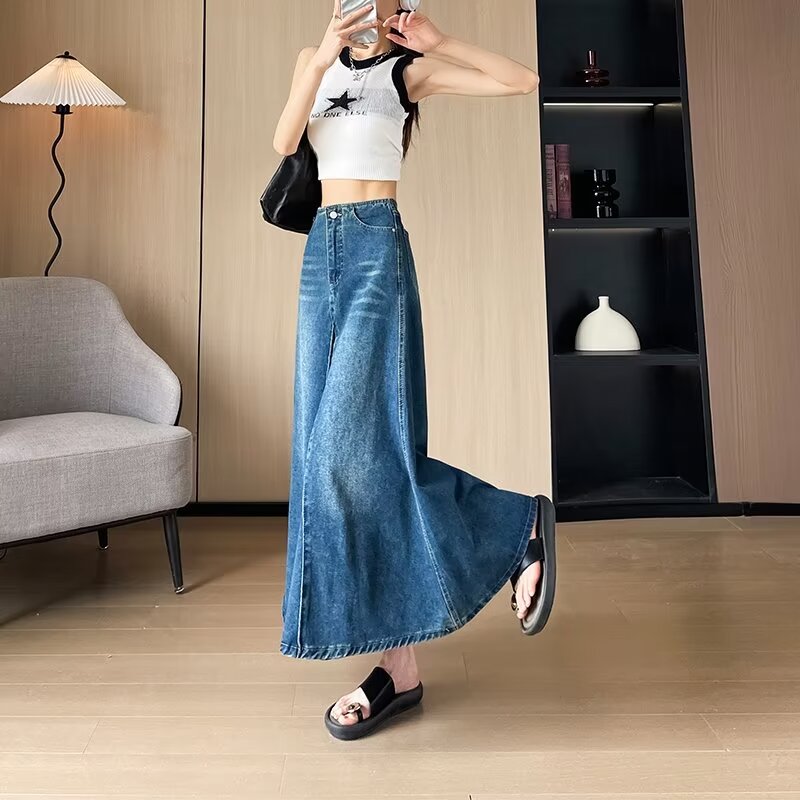 MY5526# 复古水洗百搭牛仔半身裙女春季高腰a字大摆设计感中长款裙子女裝貨源服裝批發