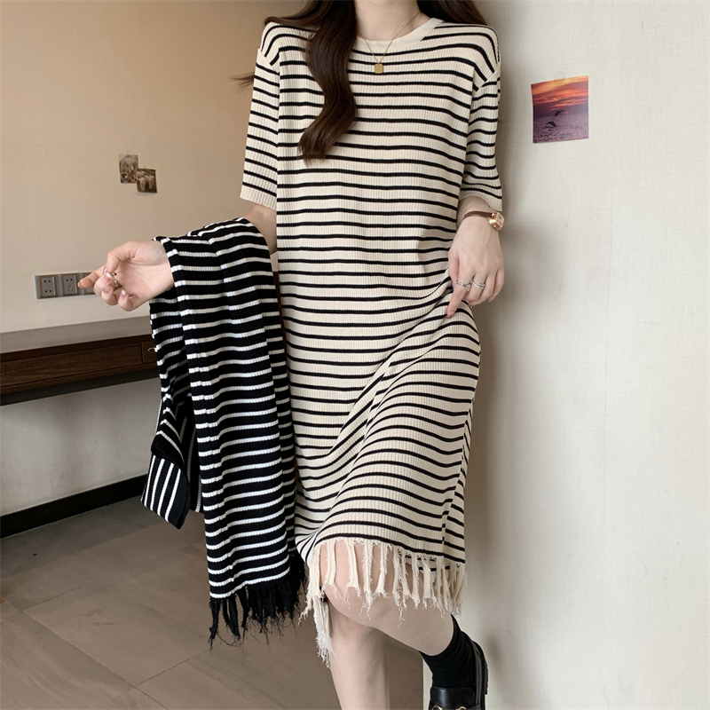 MY5635# 大码女装时尚新款胖妹显瘦气质百搭条纹流苏针织连衣裙女裝貨源服裝批發