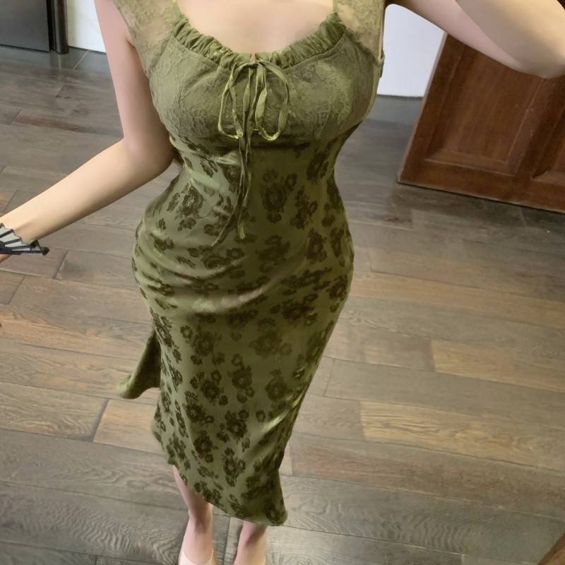 MY6420# 复古新中式轻熟风缎面提花蕾丝拼接性感露背鱼尾连衣裙女裝貨源服裝批發