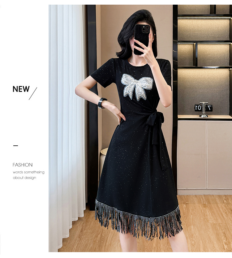 MY6498# 大码女装新款潮流蝴蝶结收腰显瘦流苏下摆短袖连衣裙女裝貨源服裝批發