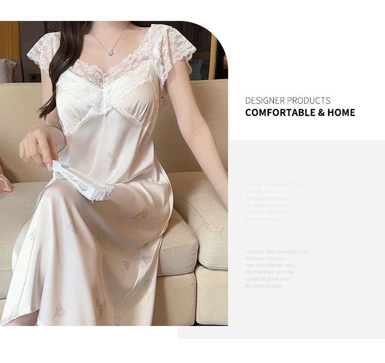 MY6500# 夏季短袖带胸垫睡裙女士蕾丝花边V领缎面冰雪丝绸睡衣女裝貨源服裝批發